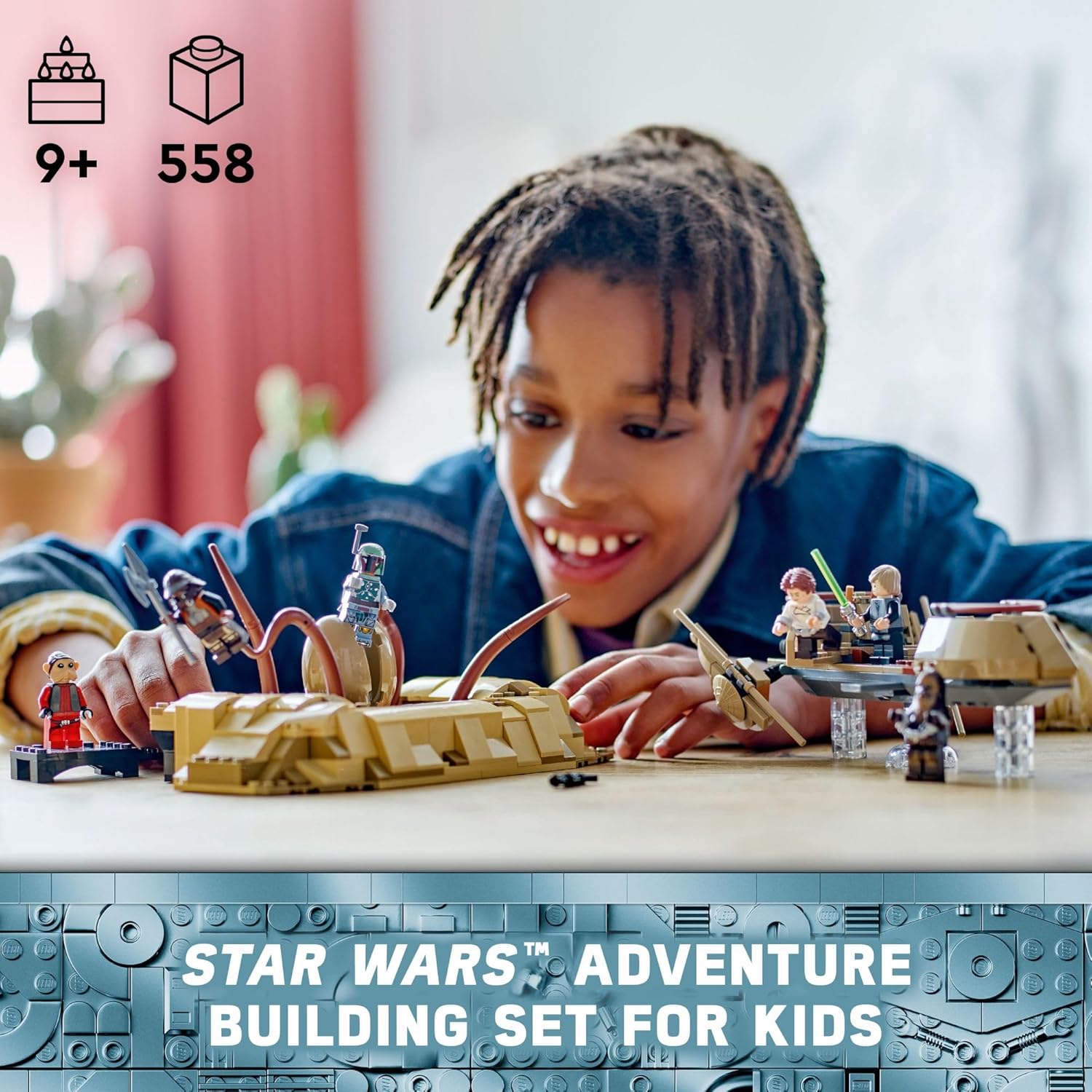 Replay a thrilling Star Wars: Return of the Jedi scene and create new adventure stories with this LEGO brick built Desert Skiff & Sarlacc Pit building toy playset (75396) for kids ages 9 and up. The desert skiff features translucent elements for a hover effect and has playful details such as a push-out plank for Luke Skywalker to walk and the foldout railing where Han Solo nearly fell off. The pit has levers to move the Sarlacc’s tentacles, and the Sarlacc has space in its mouth for a LEGO minifigure. A cool gift for boys, girls or any fan of the classic Star Wars saga, this collectible toy building set has 6 LEGO Star Wars minifigures, including Luke Skywalker, Han Solo, Chewbacca, Lando Calrissian and Boba Fett, plus authentic accessories. This set also includes a special LEGO Star Wars 25th anniversary minifigure of Nien Nunb. Find step-by-step instructions in the box and download the LEGO Builder app for digital viewing tools to make the creative experience even more fun. Contains 558 pieces.