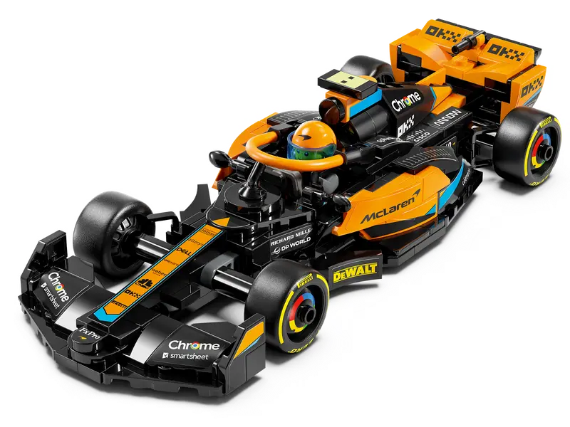 The McLaren vehicle model includes many realistic features: the black-and-papaya livery, the team-sponsor logos, the wheels with Pirelli print and the papaya safety halo. The buildable car kit also comes with a driver minifigure for kids to place behind the wheel for exciting play races.