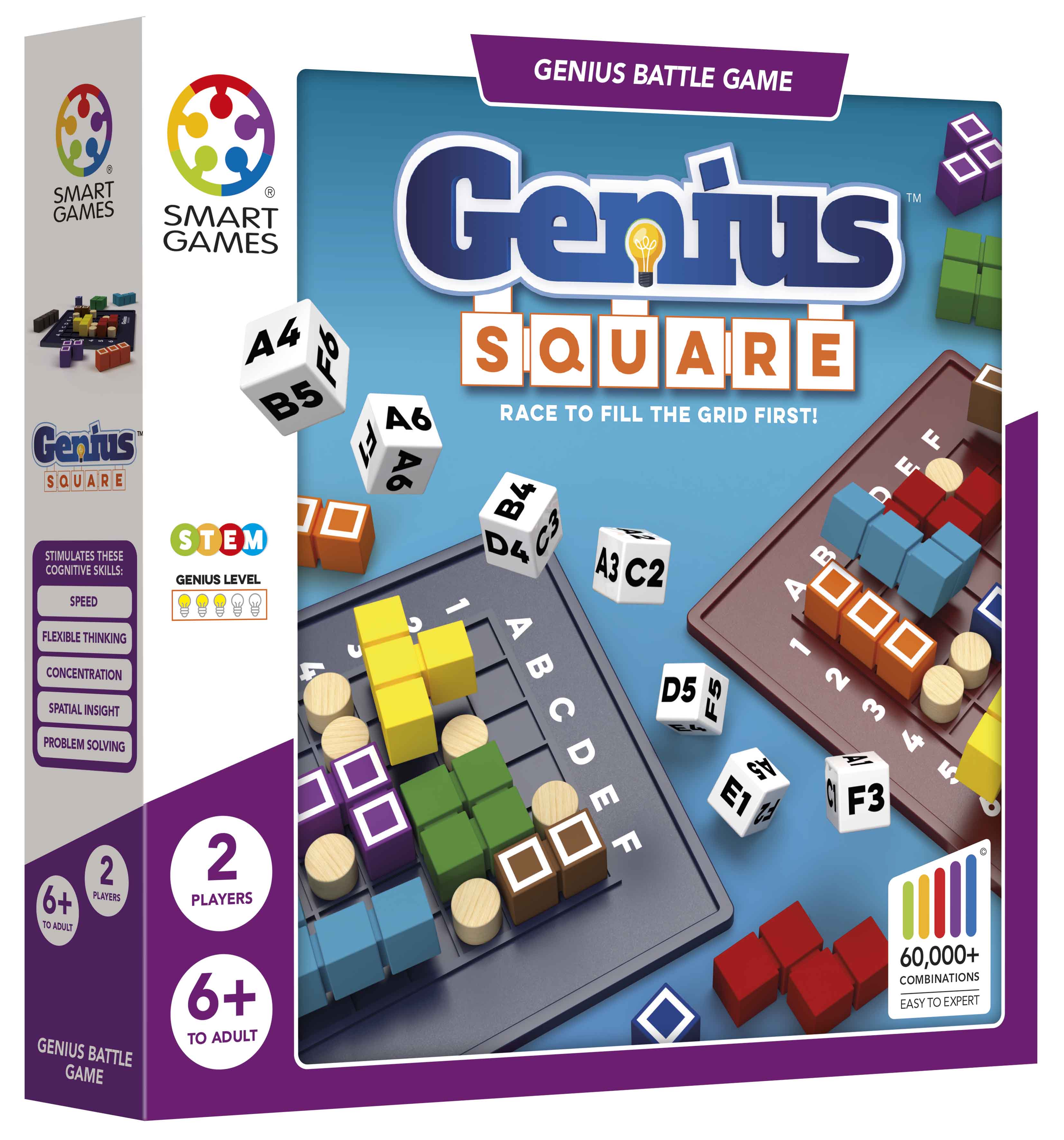 Includes 2 Genius Square grids, 2 sets of nine colored shapes, 2 sets of 7 blocker pieces, set of 7 dice