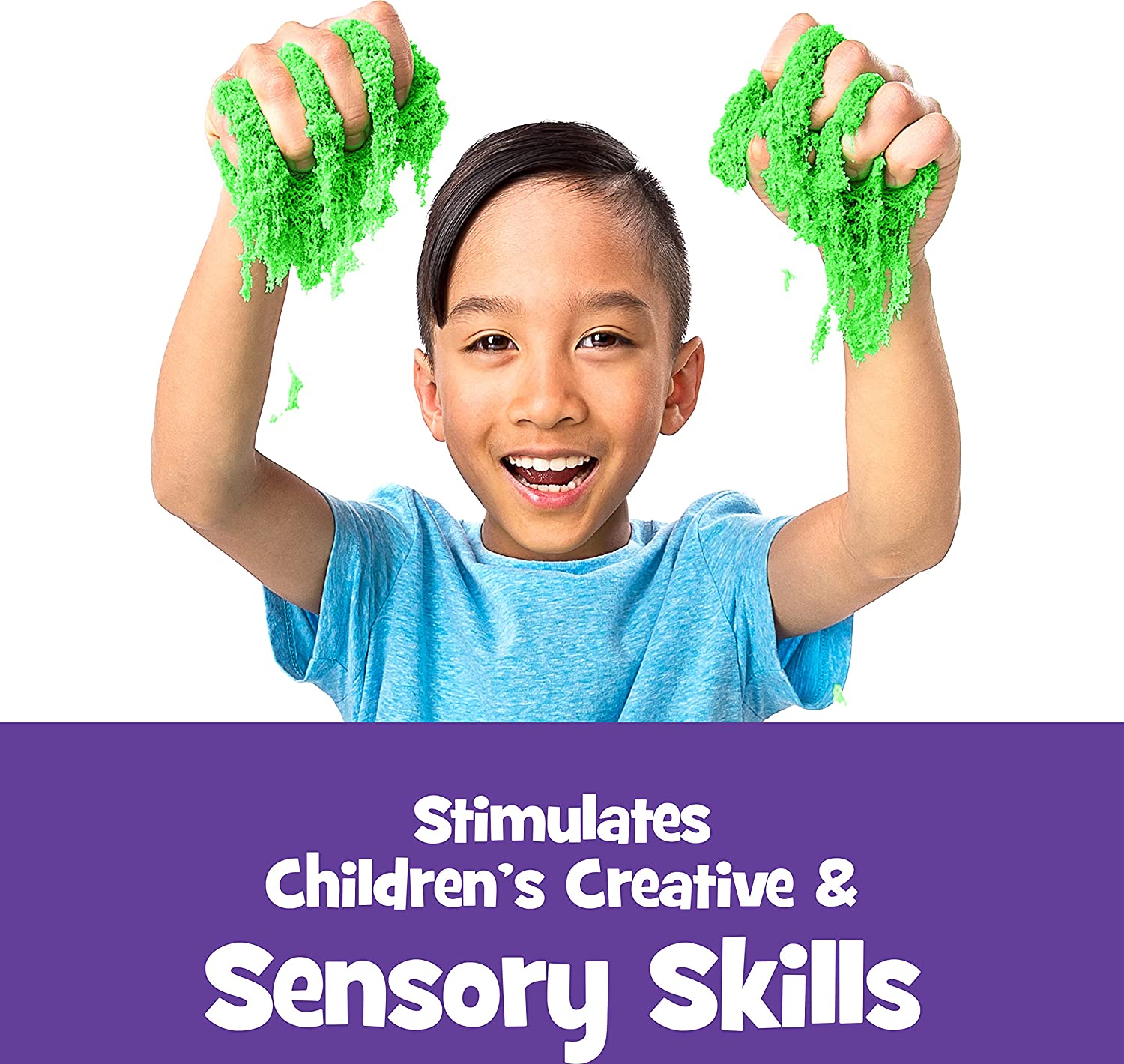 Bring the fun of wet sand indoors with Kinetic Sand, the original moldable sensory play sand. This 2-pound resealable bag of green Kinetic Sand is the perfect gift for kids ages 3 and up, especially those who enjoy sensory toys. Stretch it, slice it, squeeze it or mold it into incredible sand art. No matter how you use it, sensory sand provides hours of tactile fun. It flows through fingers like real beach sand and leaves hands completely dry. When pressed together, it keeps its shape. It’s so satisfying, you won’t be able to put it down! The unique formula of this mesmerizing, magic sand sticks to itself and not to kids for easy cleanup and storage, and it never dries out so you can create again and again. More than just great fun, moldable sand is a tactile, sensory toy that can help develop your child’s fine motor skills. Sand play provides a much-needed break from screen time and encourages independent play when learning and working from home. Kinetic Sand is made from natural sand and is wheat-, gluten- and casein-free. In addition to green sand, our 2-pound bags of colored sand are available in other bright shades including green, purple and blue. Feel the fun with Kinetic Sand for kids!