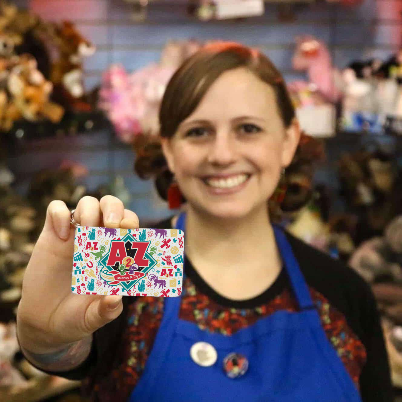 Both physical and digital gift cards can be used in person or online at A2ZScience.com