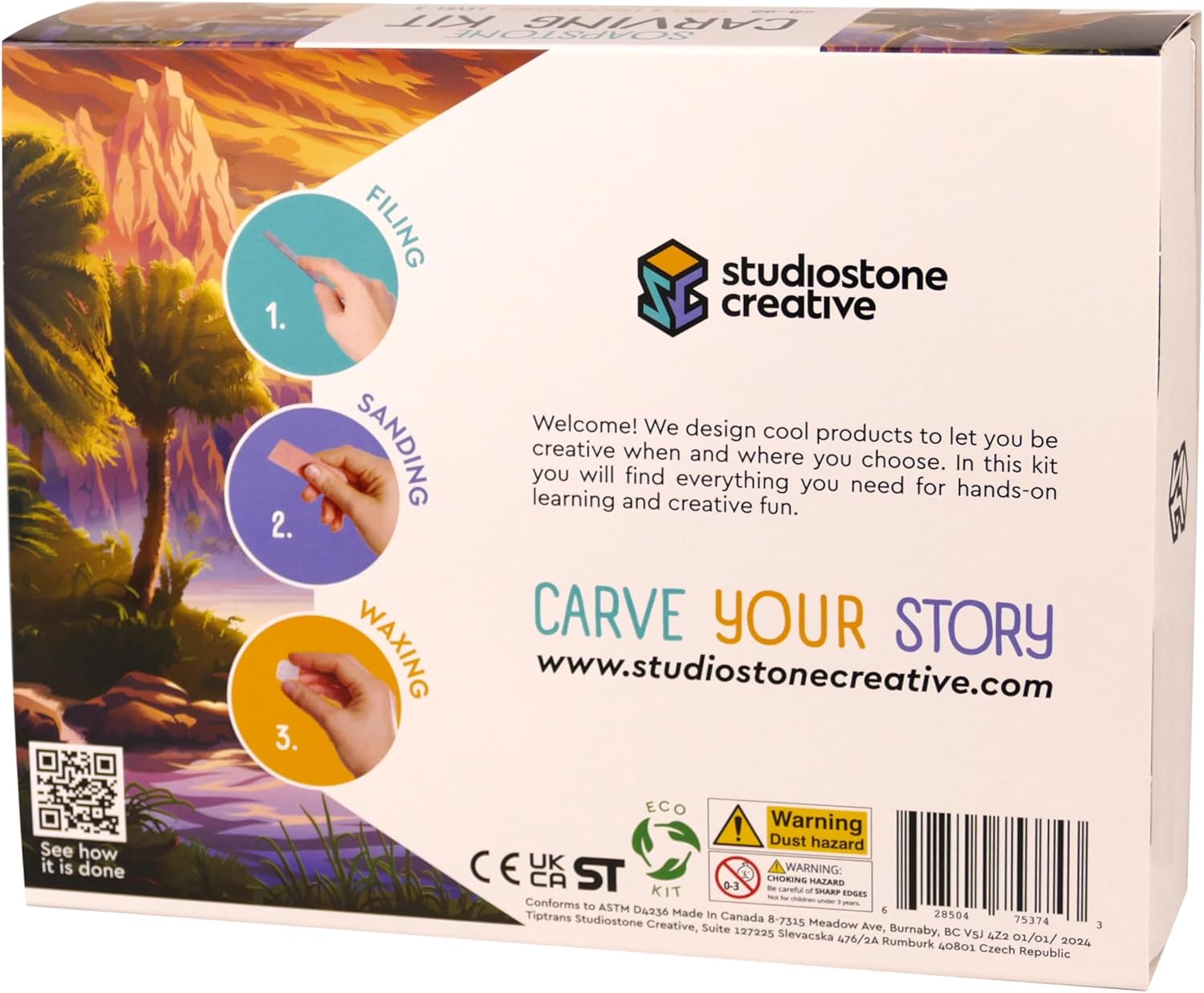 Discover the joy of crafting your own soapstone T-Rex sculpture with Studiostone Creative, an engaging and artistic experience suitable for both adults and children ages 8 and above. Our premium craft kits are meticulously crafted in the scenic landscape of British Columbia, Canada, featuring eco-friendly packaging and natural materials.