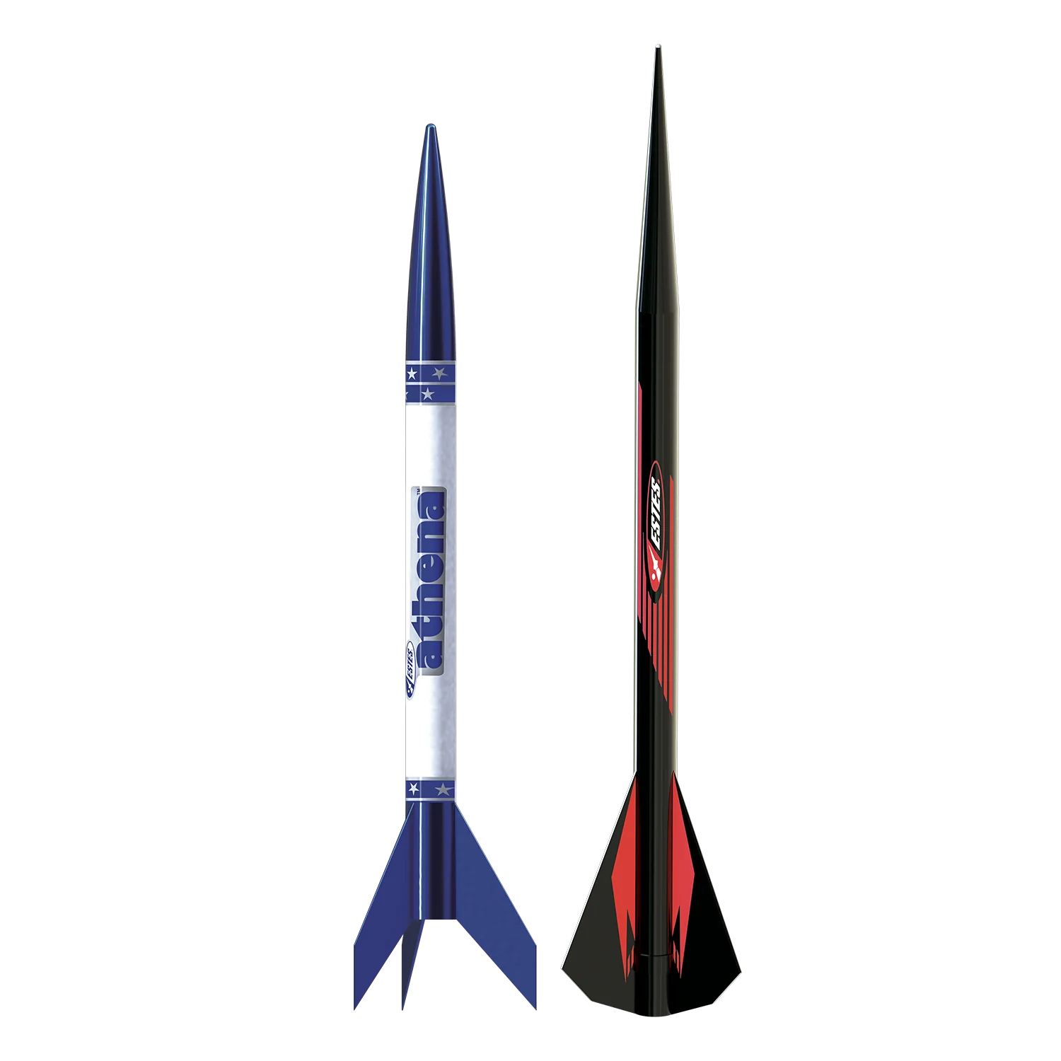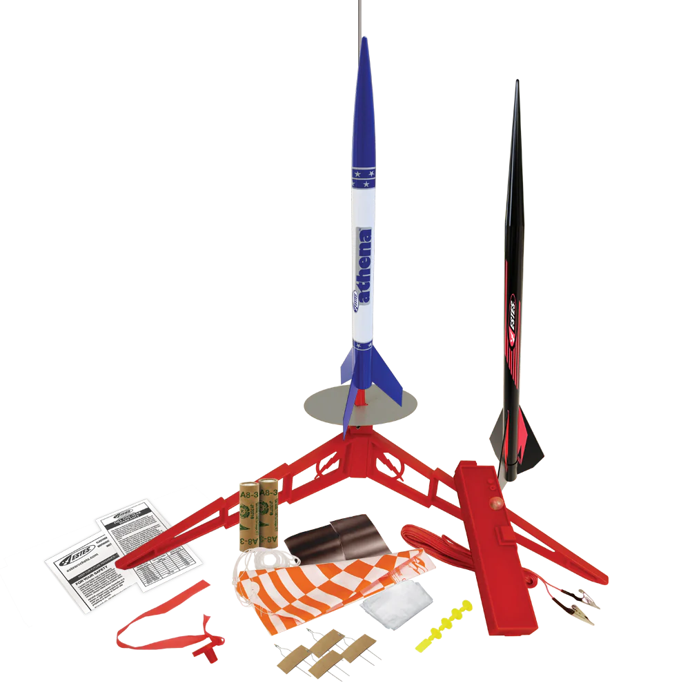 This starter set includes everything you need to launch the Athena and Xtreme rockets. It's designed to take a beginner rocketeer, build up their skills, and bring them deep into the world of rocket science. This starter set includes the launch pad, the launch controller, 2 A8-3 motors, 4 starters, 4 plugs, and 12 sheets of recovery wadding. Everything you need to experience an incredible launch day. The Athena is a Beginner's quick building rocket kit that requires no previous building experience and no paint. The Extreme is an Intermediate rocket kit that requires moderate assembly which includes gluing and painting.