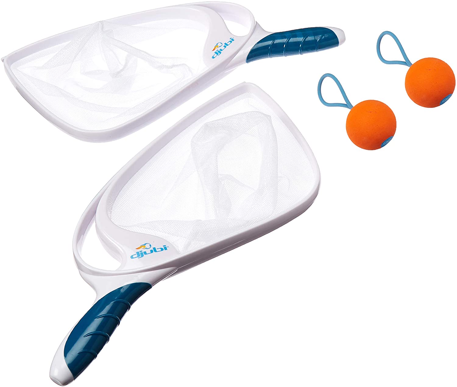 Djubi Classic is a modern twist on the classic game of catch. Djubi, pronounced joo-bee, is a fun, new outdoor toy that combines specially designed rackets with nets and a unique ball called the Djubi. Just slip the loop of the Djubi over the launch hook on the racket, pull it back and aim. Let it go and watch the Djubi soar. Catching the foam ball is easy with the deep net pocket on the plastic racket. The ball launches up to 100 feet and even floats, so you can bring the fun to the pool or beach.