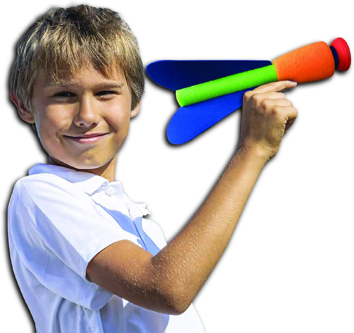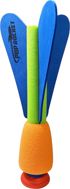 Flick it and Stick it! This Pop Rocket can fly and stick to almost any clean, flat surface. Made of lightweight foam. It's Safe, it's Soft and it's Fun! Red and Green Dart with Blue Fins. Recommended for Ages 3+. This item has been tested to meet all applicable US standards for children's products.