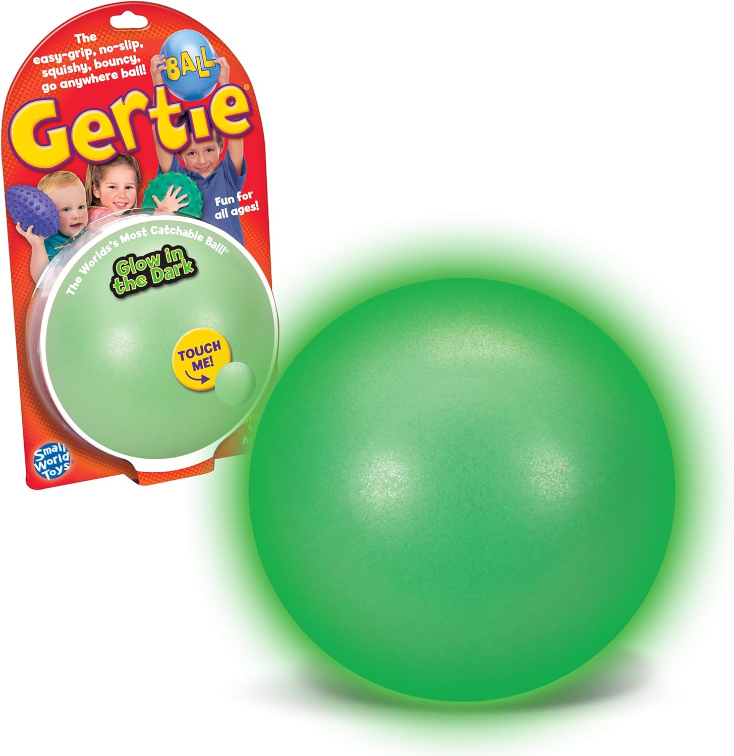 Small World Toys presents their ever popular Glow in the Dark, Green Gertie Ball. This groovy Glowing Gertie can be charged by any light natural or otherwise and then glows in the dark for up to 60 minutes. Engaging with Balls helps kids develop knowledge of cause and effect, hand-eye coordination, manual dexterity, and playing well with others. Ball is 9-inches in diameter and suitable for kids age 3 months and up.