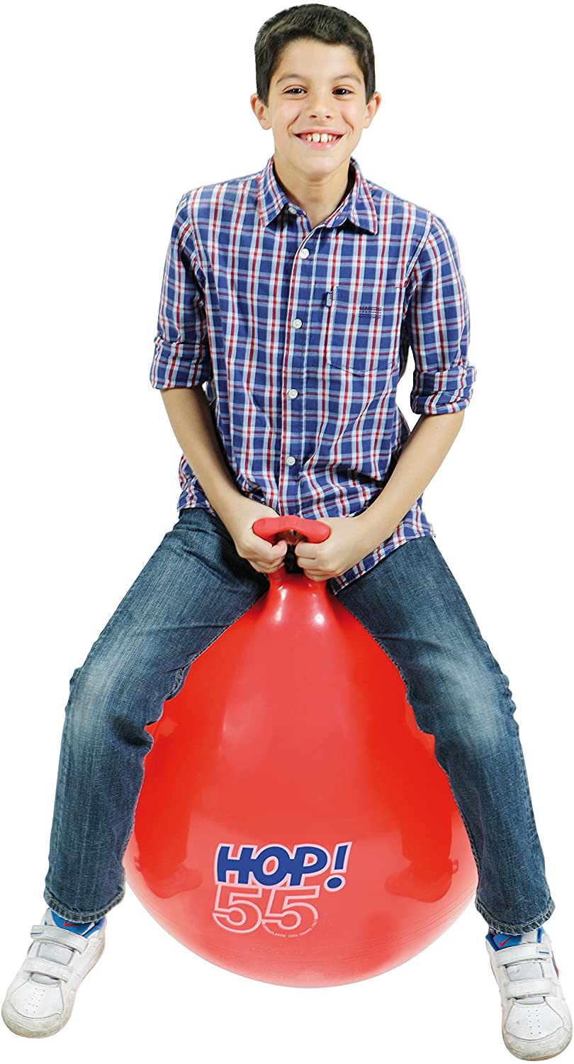 -Bouncing on a Gymnic Hop 55 promotes balance and coordination in children while providing a fun workout. -The Hop 55 ships uninflated so parents can adjust the level of inflation according to the size and age of the child; includes 1 valve and 1 plug. -Patented handgrip ensures safe bouncing; inflated ball measures 22" in diameter and has a maximum sustainable weight of 160 pounds. -Made from soft, super-strong, latex-free, BPA-free and phthalate-free vinyl for years of worry-free enjoyment. -Suitable for children ages 7 and up.