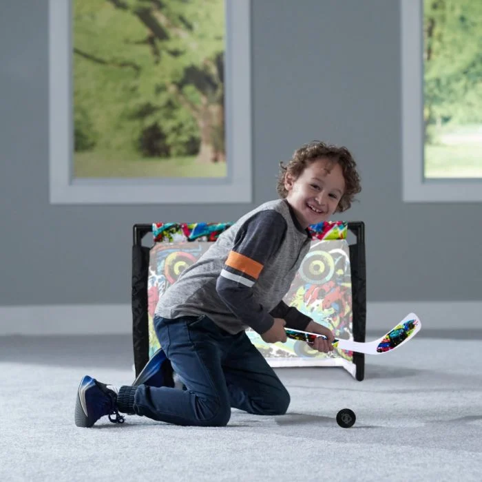 The Franklin Sports Kids Mini Hockey Set is exactly kids need to get the mini hockey fun started! This all-in-one youth mini and knee hockey set has all the equipment necessary for two player indoor hockey fun. Each Kids Mini Hockey Set. Each set comes with (1) 28" inch x 20" inch knee hockey goal, (2) mini hockey sticks (one right handed, one left handed), and (2) soft foam mini hockey balls so you have everything you need to get the game started. Plus, the lightweight, portable mini goal assembles in seconds so you can spend more time in the game and less time on setup. It has never been easier for young hockey fans to take the game on the go and play indoors or outdoors in the driveway. This youth toy hockey set is the perfect gift for any young hockey fan ages and up to practice their skills and have a ton of fun. With this mini hockey goal set you can always get in the game, so grab your Franklin Sports Kids Mini Hockey Set and drop the puck today! KIDS MINI HOCKEY SET: This complete youth knee hockey set has everything kids need to start the mini hockey fun and is designed with some added flair to bring the game to life! EVERYTHING YOU NEED: This toy hockey set comes with (1) 28" x 20" mini goal, (1) right handed mini stick, (1) left handed mini stick, and (2) foam mini hockey balls included. EASY ASSEMBLE: The easy assemble mini goal snaps together in seconds and comes with a slide on sleeve net so you can spend less time setting up and more time playing! LIGHTWEIGHT + PORTABLE: This goal set is super lightweight and easy to take on the go so you can bring the game anywhere! PERFECT FOR KIDS: This set is the perfect gift for any young hockey player who wants to get in on the mini hockey action and is recommended for ages 3 and up.