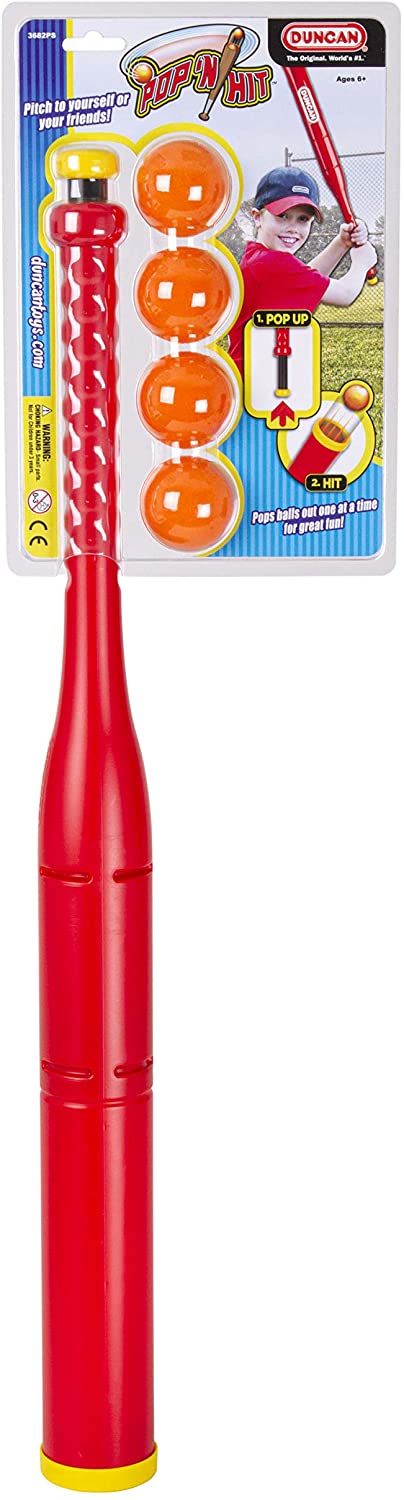 With the Pop 'N Hit Bat, you can easily pitch to yourself or your friends! Simply PULL, & POP - Balls pop every time! The Pop 'N Hit has a unique patent pending design that pops balls out one at a time for perfect practice. The pop-up self pitching mechanism at the end of the bat launches balls 5' to 10' in the air to allow for a full swing. Features a 28" length and a durable, high-impact plastic construction.