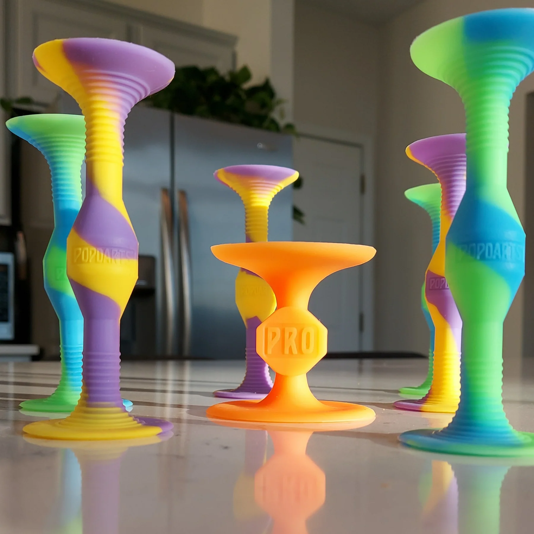 WHY CHOOSE POPDARTS? In a world that isolates us with devices, we bring you a game that brings friends and family together, fuels creativity and challenges abilities! WHAT’S INCLUDED IN A SET? 3 Blue/Green Swirled Popdarts | 3 Purple/Yellow Popdarts | 1 Orange Wigglenobber Target Marker | 1 Mesh Carrying Bag with rules printed right on the bag WHERE CAN I PLAY? Our compact sets can be played wherever you go, indoors or outdoors. Popdarts stick best to smooth surfaces like a countertop, refrigerator, window, car windshield, glass door, surfboard – be creative! HOW DO YOU SCORE? The closest Popdart to the Target Marker = 3 points. Every other Popdart that sticks = 1 point. Landing on the Wigglenobber Target Marker = 10 points.Use “Cancellation Scoring” (just like cornhole). For example: 5 blue – 2 green = 3 blue. Each game consists of multiple rounds! First team to reach 21 points wins!