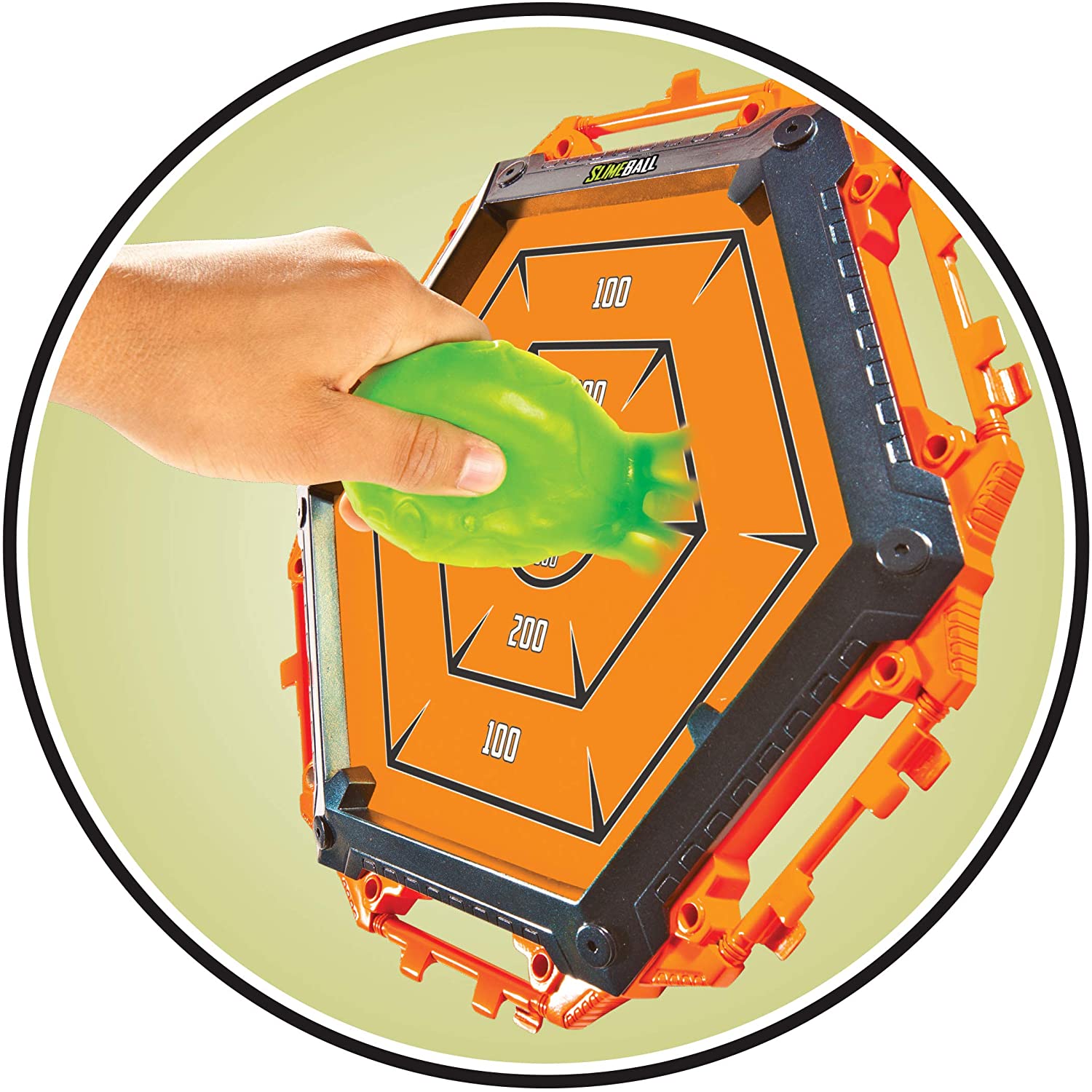 Test your aim with the Slimeball Flinger darts! Shoot squishy slime-balls up to 30 feet using the Flingers. Or shoot slime sling balls right from your fingertips with built-in launch mechanism, just like a rubber finger sling-shot. Diggin’s Slimeball Flinger comes with 2 Flinger launchers, 4 green slime balls and a sticky slime target. Slime throw target measures 10 x 10 x 1 inches. Slime fling darts have a great squishy feel, but aren't sticky and won't markup your walls. Slime squishy balls only stick to sticky target slime board. To make your slime toy target set stick like new, and to remove any dust, occasionally wash target, ball launcher fling set and slime target balls with soap & water. Play inside with your Slimeball shooter toy or take it outside!