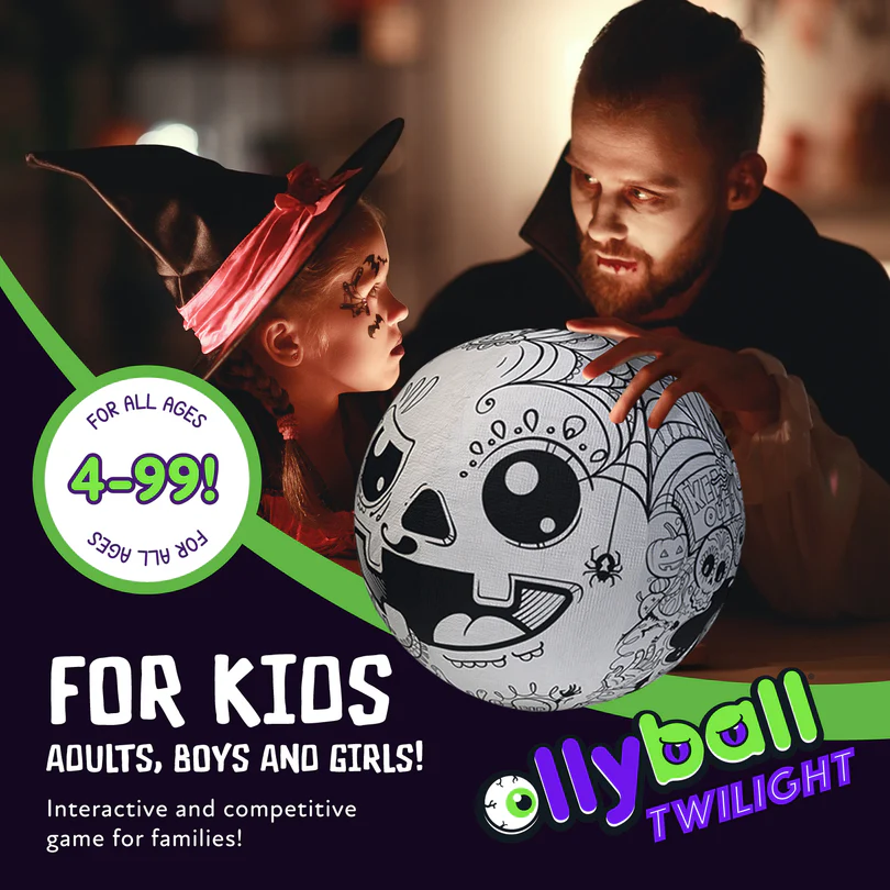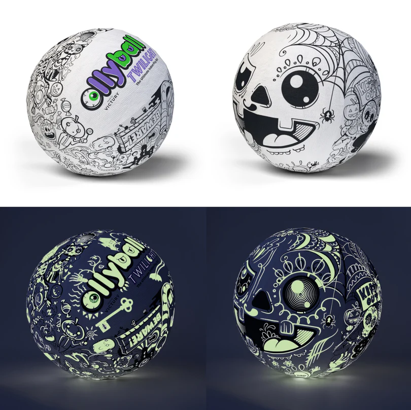 Ollyball TWILIGHT is the same Toy of the Year Award Winning 12" Ollyball with a Spooky Jack O'Lantern Halloween Glow in the Dark Magic! Ollyball TWILIGHT can be colored in with markers or crayons to personalize your Jack O'Lantern and perfect for Halloween parties ! The artwork has ghosts goblins and Día de los Muertos Skeletons!