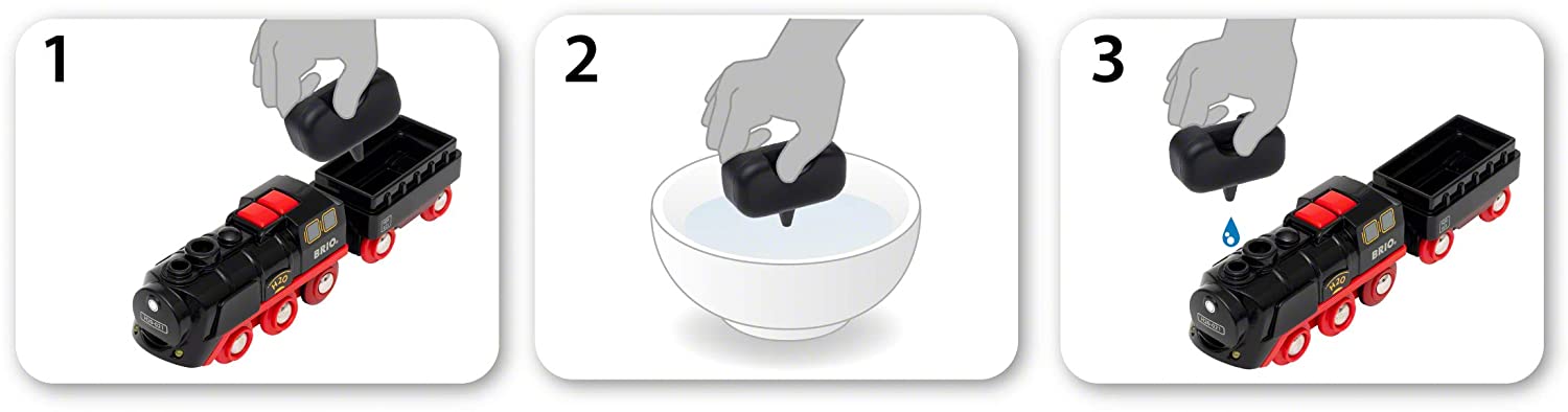 This battery-powered engine produces safe-to-touch steam from its chimney as it speeds down the tracks. Once you’re out of water, you can easily refill the engine using the refill load that’s being pulled behind the train. Lift out the black refill load from the cargo wagon and carefully fill it with water, inject the water into the engine via the filling chimney at the front and then you’re ready to go again.