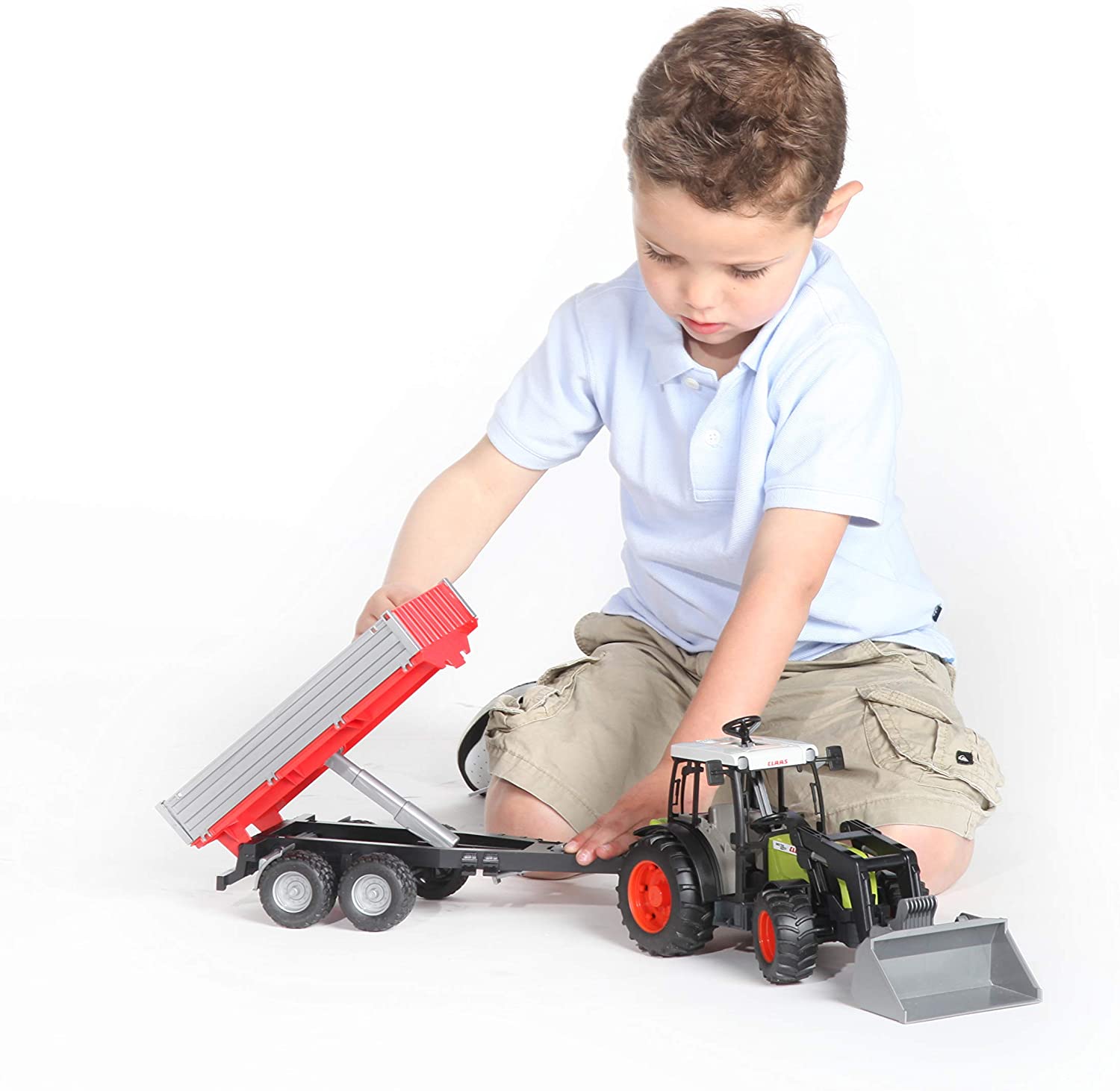 The Claas Nectis 267 F with Frontloader and Trailer #02112 is fully functioning like the real Claas Nectis tractor and comes included with typical BRUDER features, such as standard front and back coupling which allows the player to combine this tractor with all farming equipment available from BRUDER for a wide variety of playing options. The Claas Nectis 267 F with Frontloader and Trailer #02112 includes these fun features: off-road full floating axle which can be steered, smooth steering thanks to steering wheel extension through the sliding roof, receiver for front loader, detachable Frontloader, sculpted tires, and standard front and rear coupling. The Tipping Trailer, also sold separately as item #02019, includes these fun features: fold-out sustainer, a tilting stake body, 3 fold-down side boards, off-road tandem axle, and rear drawbar coupling, and sculpted tires.