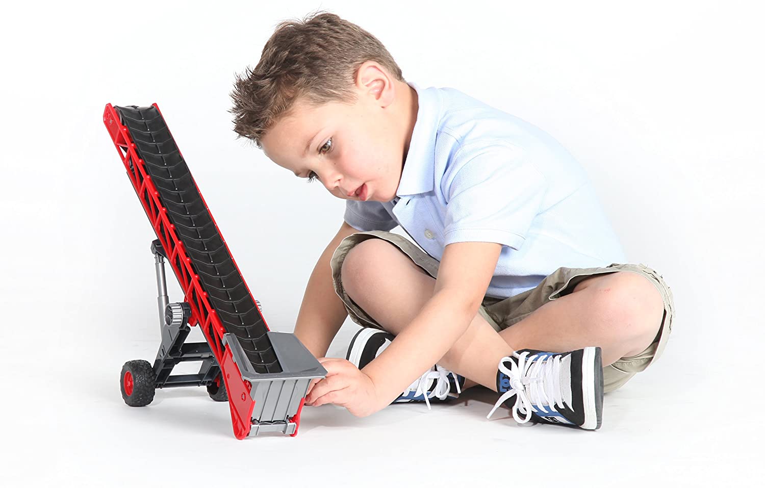 This Bruder Conveyor Belt distinguishes itself by its attractive design and its lifting and conveying mechanisms that are easy to use thanks to the installed crank. The mechanisms can be used to lift hay bales onto the trailer and transport them to the barn as well as transport and unload sand into dump trucks. The conveyor belt can, of course, also be hooked on to all Bruder towing vehicles such as tractors, Unimogs, dump trucks including the Sprinter and construction vehicles equipped with a drawbar coupling.