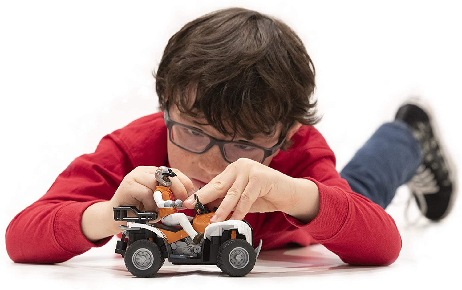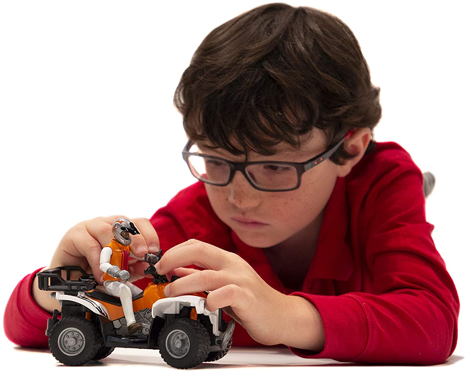 A quad combines the fun of a motorcycle with the flexibility of an off-road vehicle. Little wonder then that quads are used in forestry, agriculture, on construction sites or for recreational use, and are becoming more and more popular. The BRUDER quad has a very modern and high-quality design, leaving a lasting impression on or off the road. The suspension of both axles and the steerability of the front axle make the quad very versatile and allows pinpoint manoeuvres even in difficult terrain. The quad is also ideal as a commercial vehicle thanks to its removable luggage rack, trailer coupling and tool holders. The vehicle together with the bworld figure could hardly be any more realistic. The impression you get of the figure with his helmet and modern protective vest complements the off-road racing feel. The firm grip on the handlebars and a driver's seat that has been optimised for a sporty posture mean the driver stays in control even when speeding over impassable terrain. A stable bullbar and good road-holding tyres complete the picture.