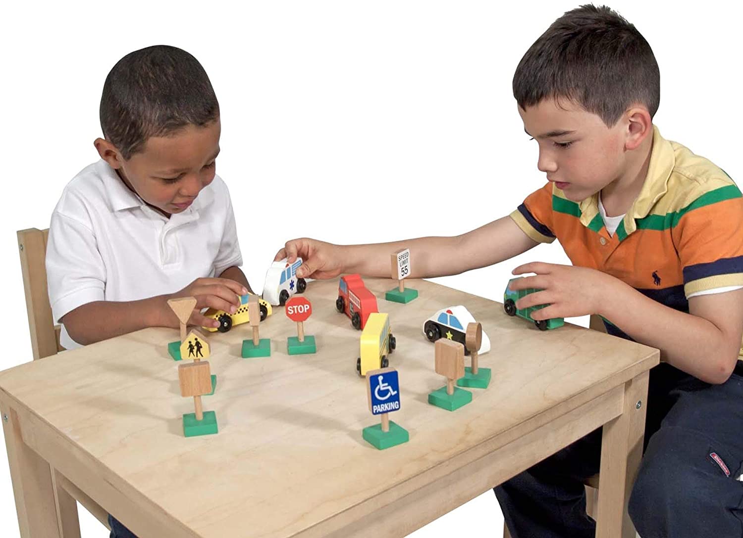 Six wooden vehicles and nine familiar signs furnish a world of travel and pretend-play fun! Car-loving kids will find everything they need to set up a busy street or add to train sets and blocks: The set includes emergency vehicles, a school bus, a taxi, garbage truck and nine brightly painted traffic signs for imaginative play. The included play extensions suggest skill-building activities to improve vocabulary and sorting, too. All 15 pieces store neatly in the compartmentalized wooden box when playtime is over.