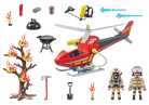 Figures: 1 pilot, 1 firefighter; Accessories: 1 firefighting helicopter w. water bullet, 1 pilot helmet, 1 firefighter helmet w. visor, 1 tree w. attachable flames, 1 grill, 1 tuna can, 1 bottle of ketchup