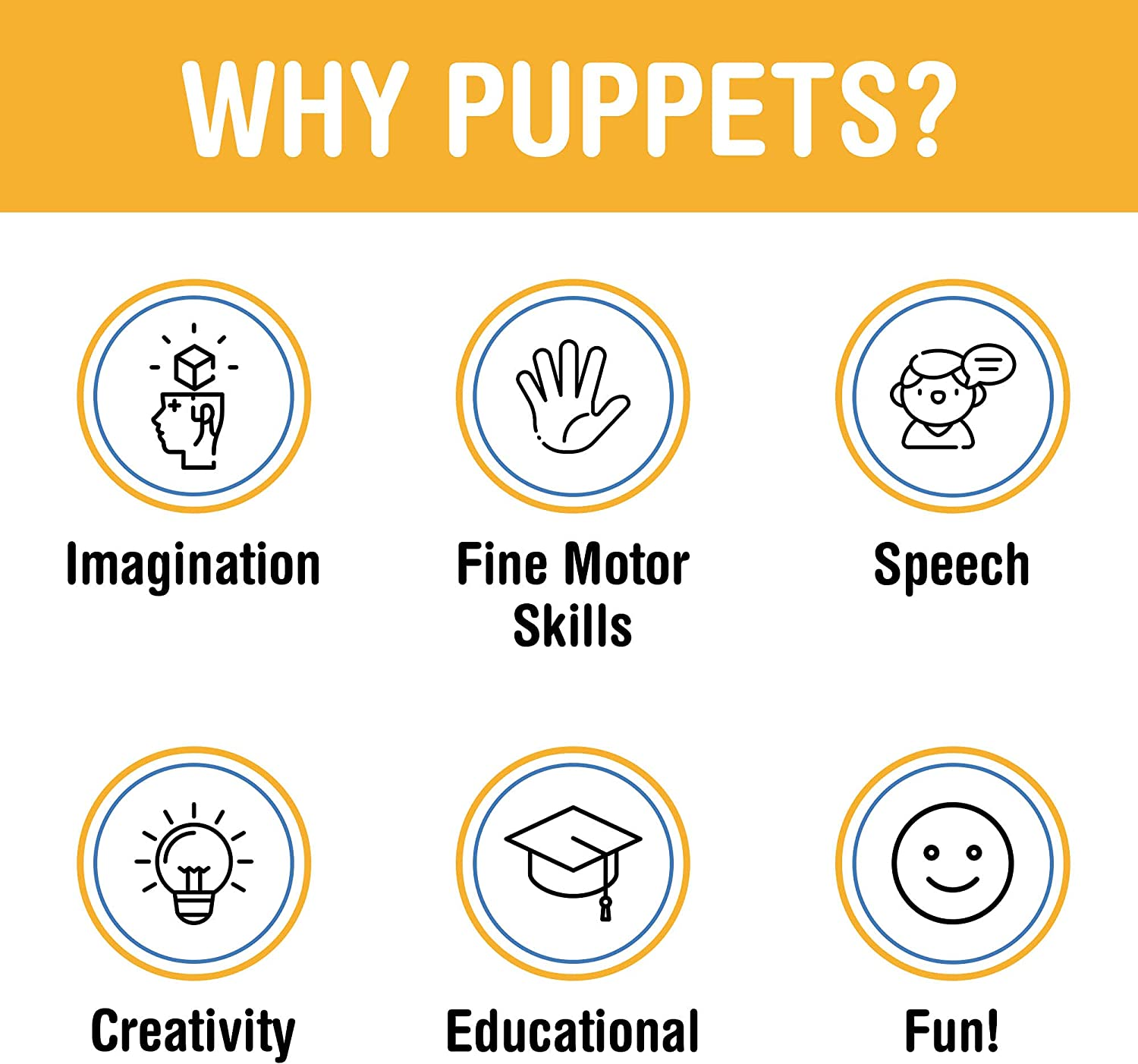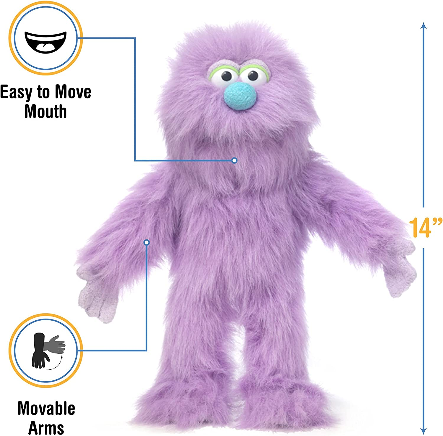This beautiful hand puppet measures about 14 inches tall (from head to toe). Puppets like this are not only fun- they're educational as well. Let your child's imagination soar with this great, creative, pretend play toy! Mouths and hands are very easy to move. Simply insert your hand up the bottom of the puppet. Your pinky and thumb can be inserted into the slots on the inside of the body to operate the hands. It can be tricky at first to get everything moving at once, but the main thing is moving the mouth- which is very simple.