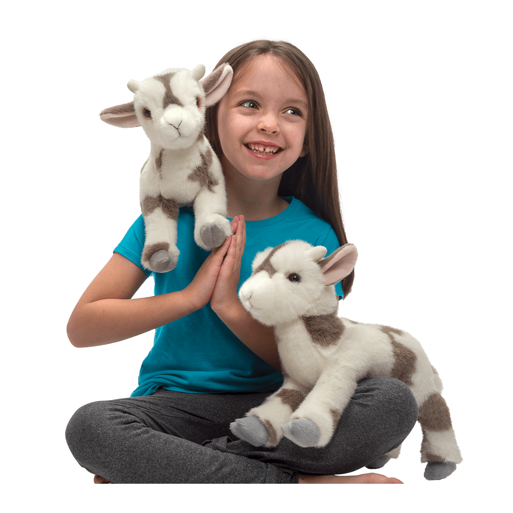 Frolicsome and mischievous, Goats have gained widespread public appeal. Now you can bring home one of these captivating critters for yourself! Gisele the DLux Goat stuffed animal is soft and sweet and delightfully low maintenance! Featuring an engaging design and the high quality materials the Douglas DLux collection has come to be known for, Gisele is an ultra cuddly companion that will win the hearts of Goat lovers of all ages. She features a grey and white spotted coat and floppy, cloven hooved feet. Stitched facial details and large, expressive eyes lend this barnyard baby an irresistible appearance. For non stop cuddles and endless smiles, make Gisele the DLux plush Goat part of your family today
