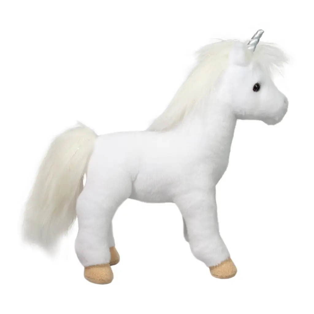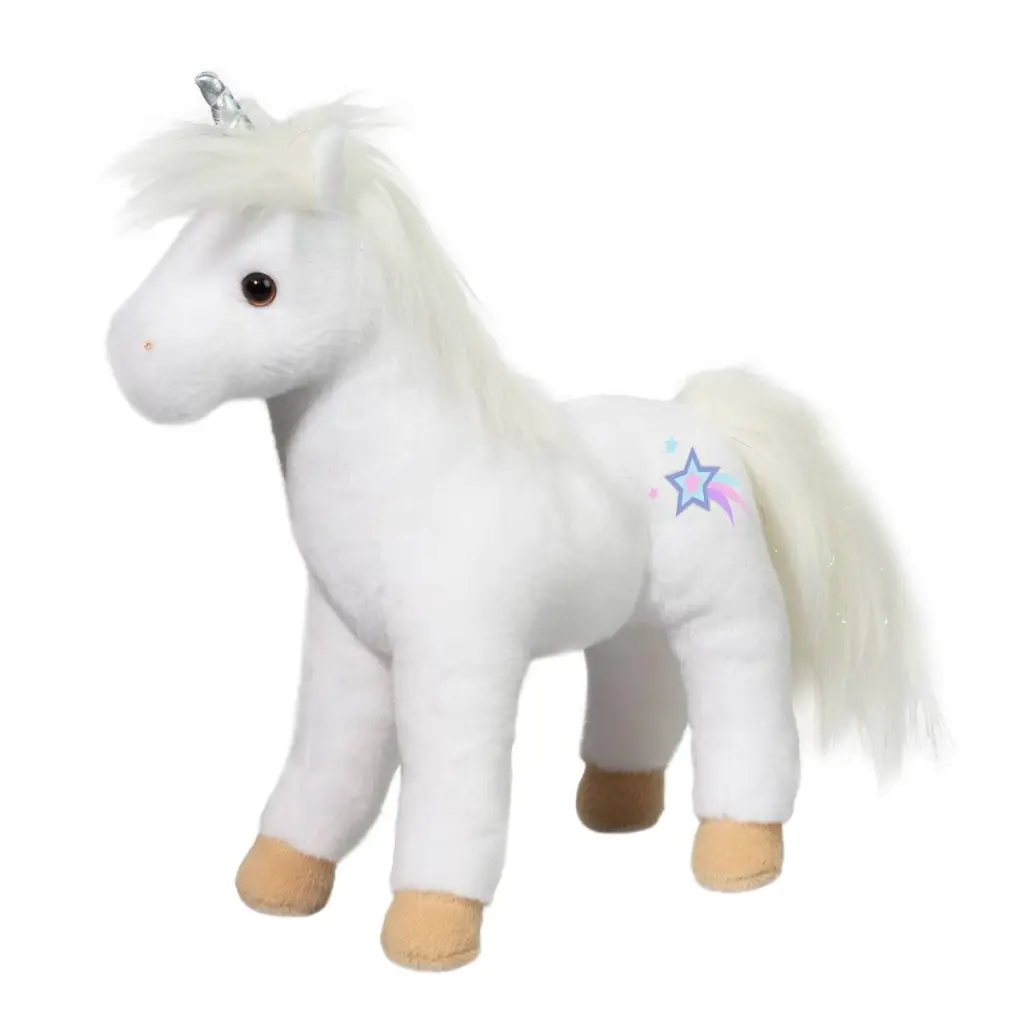 Perfectly sized to be a take-along friend for young fantasy lovers, Vega the Unicorn stuffed animal is eager to see what adventures lie in store for today! She stands at attention in an upright pose that’s ready for play but soft enough for hugs. Iridescent strands of tinsel run through her fluffy mane and tail and add a subtle fantasy sparkle. The embroidered emblem on Vega’s hip is a nod to the celestial meaning of her name and depicts a falling star created in soft, pastel colors. Equally suited to be a daytime playmate as she is to be a nighttime friend with which you can share your dreams, Vega is the ideal sidekick for every young princess!