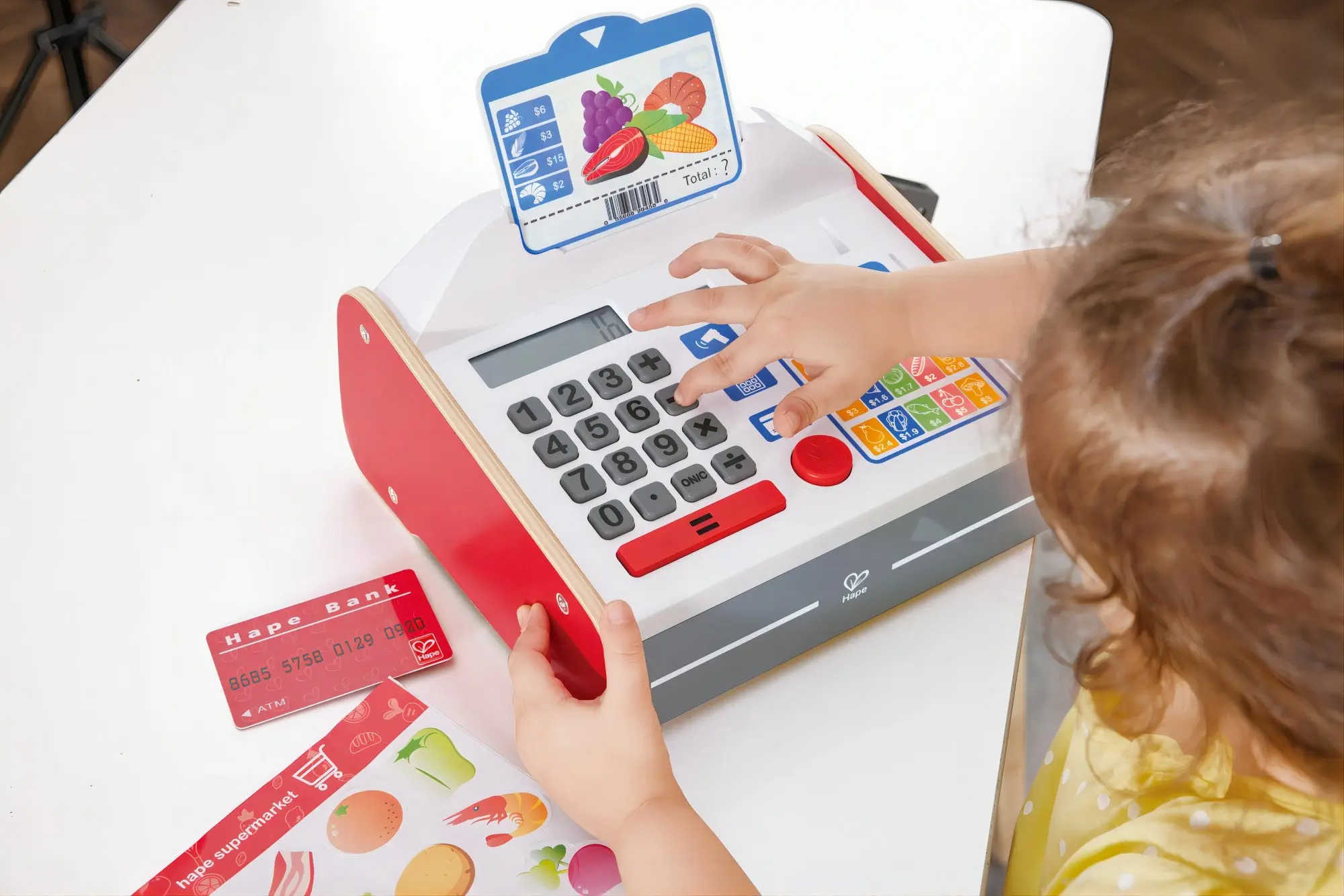 Choose the groceries you want to buy and display them on the screen. Then use the solar calculator to calculate the price! You can either use the sound and light scanner to pay by credit card, or accept cash and give change from your drawer!