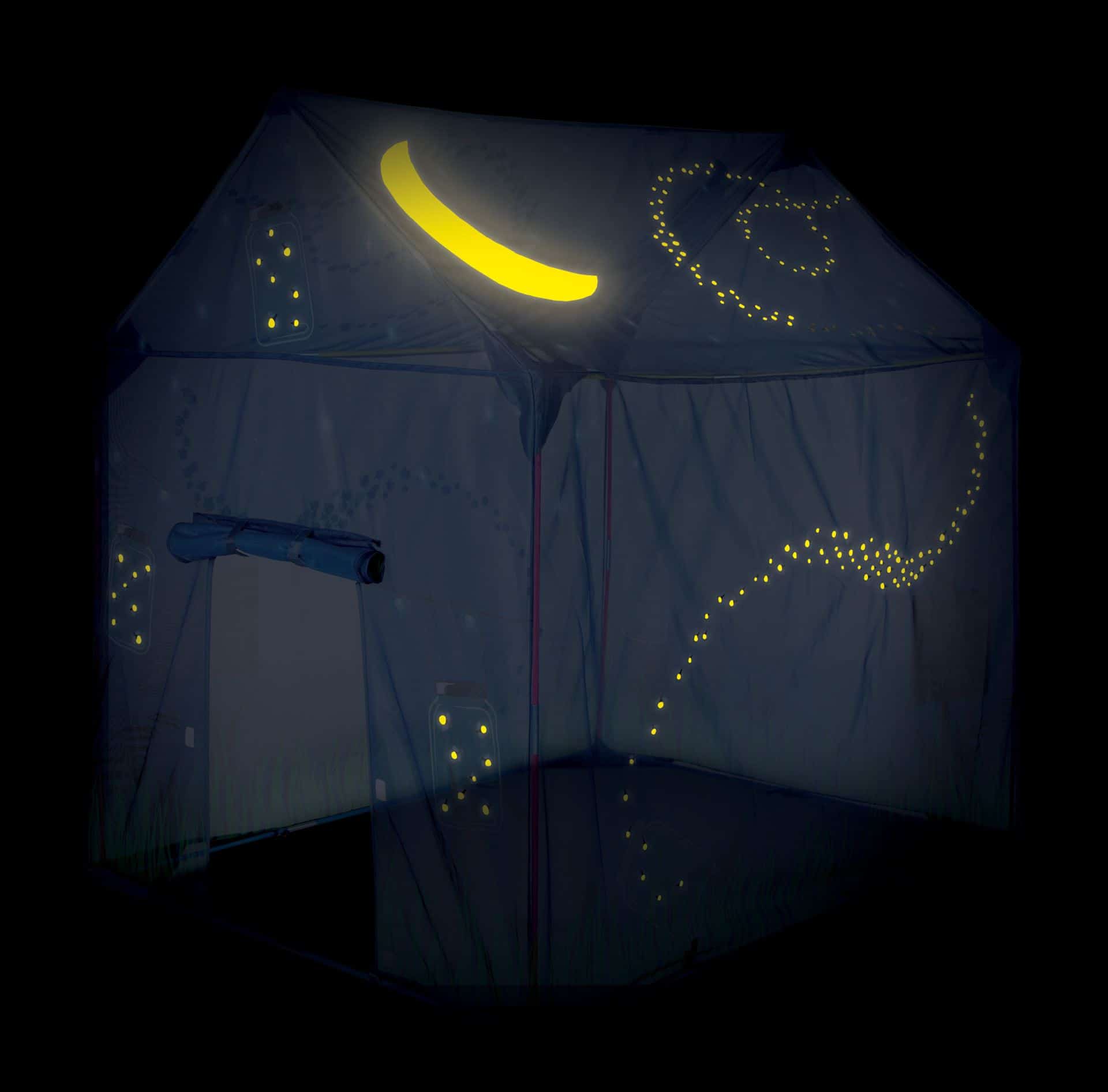 As the day fades away, the fireflies will play! There's nothing quite as magical as watching your little one's eyes shine bright as they gaze upon the twinkling night sky through our No-See-Um mesh with a full graphic print. Featuring G3 color coated super poles and safe radius-cut hook and loop fasteners, our 100% polyester mesh Glow N' The Dark Firefly House Tent offers the perfect vantage point for your child to explore the nighttime in a comfortable and stimulating environment. The moon, fireflies, and lights are all glow-in-the-dark, making this 48” X 38” X 48” tent a must for any mini stargazer!