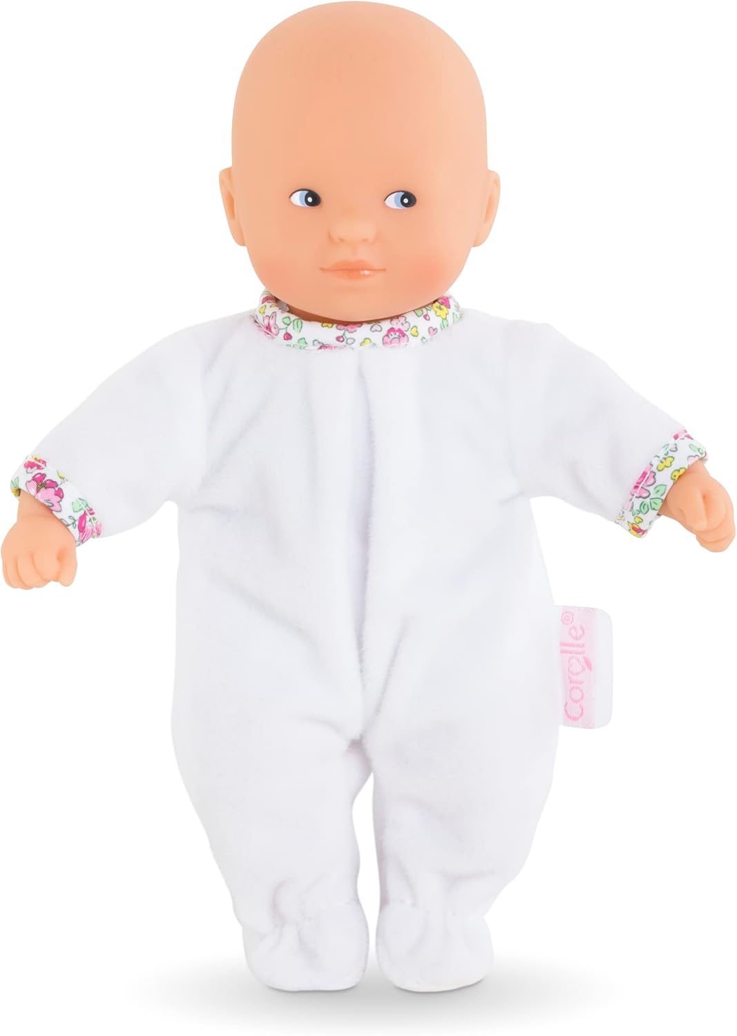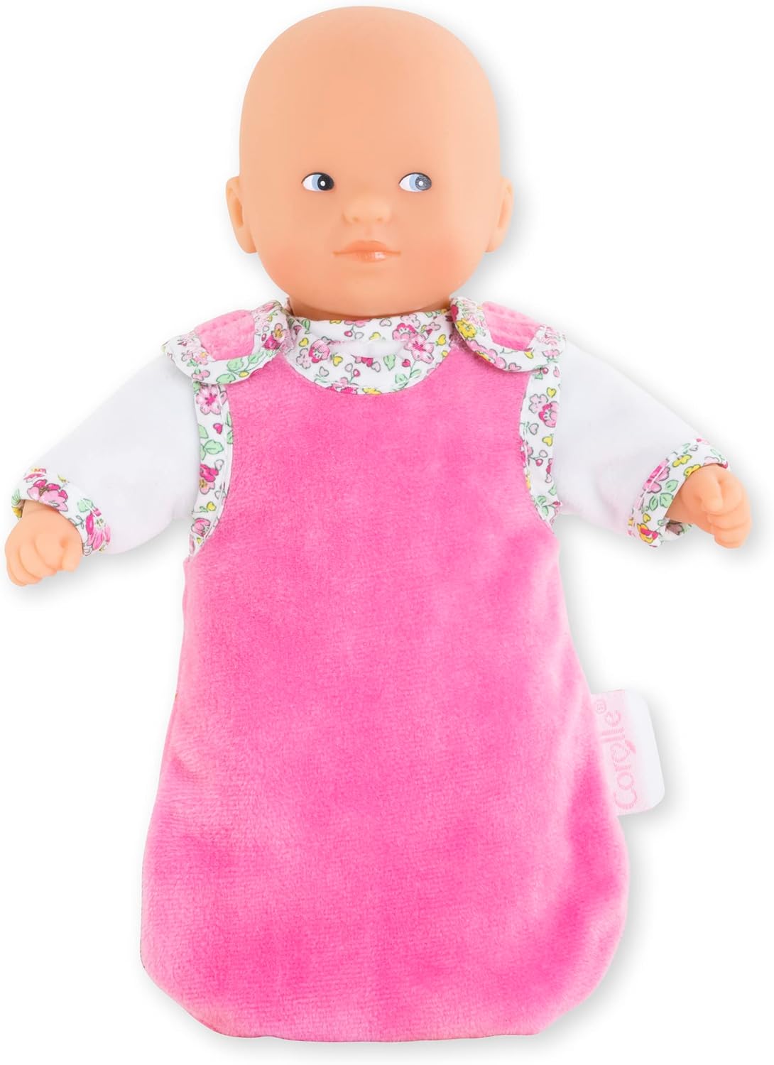 Mon Mini Calin Good Night Blossom Garden is a set containing one 8” lightweight Mini Calin that can be taken everywhere you go, pajamas and a bag sleeper. Hook-and-loop fastener on the pajamas and bag sleeper make dressing and undressing easy. The doll's face, arms and legs are made of delicately vanilla-scented, soft-touch vinyl. Painted blue eyes. mon premier poupon Corolle: small baby dolls with their own clothes and accessories so even little ones can have early nurturing time. Ages 18 months and up.