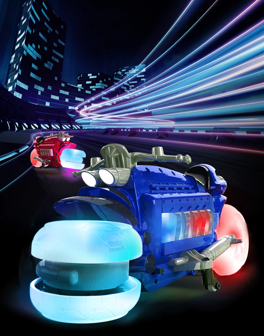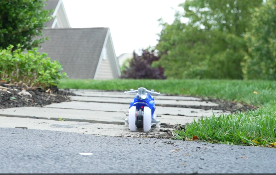 Motorcycle Stunt Bike! Actions Include: Sidewind/Hovering & Spinning Front Wheel Rotates Horizontally to Allow Unique &Fun Sidewind/Hovering Action. 5 Bright Color Changing LED Lights 49 MHz Remote Requires: 2AA Batteries & Vehicle 4AA Batteries (Batteries not included) Ages 3-Adult
