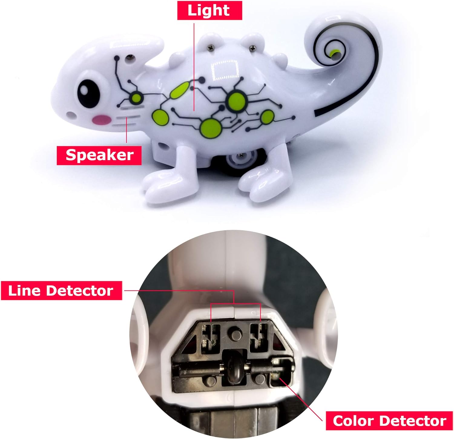 Imagination & Interactive Toy for Kids: Draw a dark line on the white or colored play sheet and the inductive STEM toy chameleon will follow the line you draw. It will change its body colors and triggered sounds if it recognizes the available 5 colors on the sheet. Kids can use their imagination to create some games & interact with the chameleon robot!