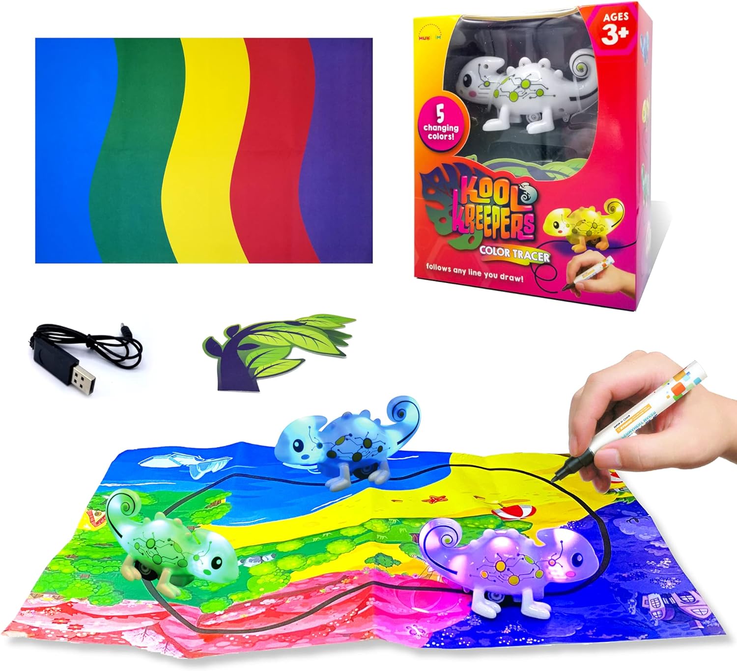 STEAM Educational Toy For 3 Year Old: The inductive science toy for girls & boys includes a color changing chameleon, 2 colored play sheets, a dry erase marker, and a USB cord. 20 min charging for 25 play time! Simply draw line or patterns on color sheets and the inductive magic toy will find the way out and change its body colors! Adorable gift option!