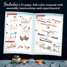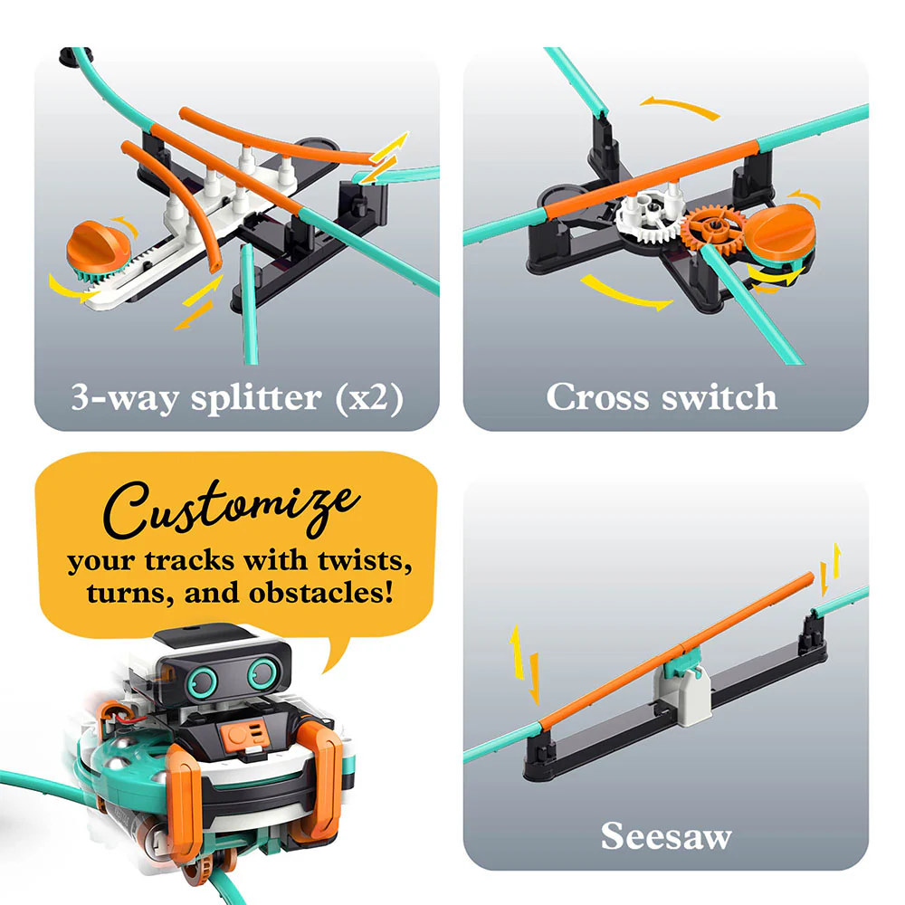 and dozens of track layouts from over 180 durable, plastic parts. Choose any of the 26 configurations in the manual or use your imagination to invent your own! Combine the snap-together track segments with the three special connectors – the seesaw, the splitter, and the cross switch – to add twists, turns, and obstacles to your routes.