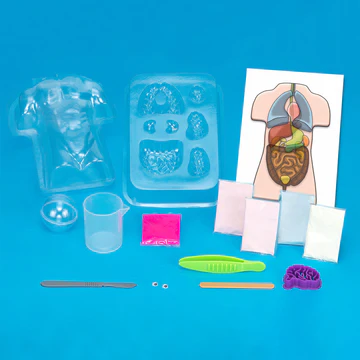 A squishy heart! Colorful lungs! Brains made of … putty?! Anatomy has never been so fun! With the Gross Anatomy science kit, you can learn all about the human body and its vital organs by making your own squishy, slimy models of them. Mix up colorful slime mixtures and pour them into the included molds to make some of the human body’s major organs: the heart, lungs, kidneys, stomach, large intestine, small intestine, and liver. Then, arrange your squishy creations in a clear plastic torso to visualize where they fit in your body. Next, use the included colorful putty and brain stamp to cut out a squishy brain model as you learn fascinating science facts about this important organ. You can even pretend to be a doctor by experimenting with a safe plastic scalpel for a fun, mushy, hands-on learning experience!