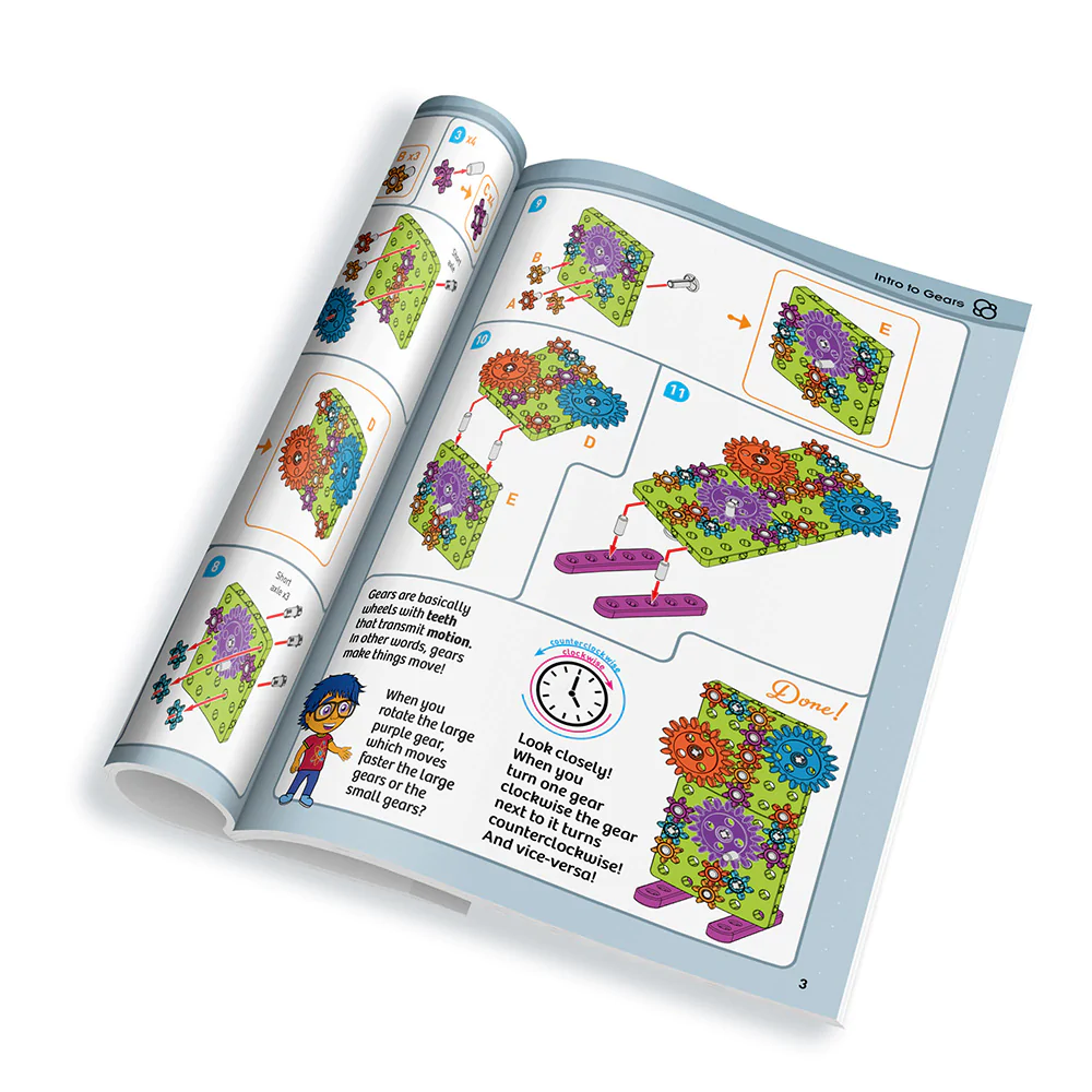 Intro to Gears is a fun and engaging way to explore the many amazing things gears can do. With many big and small gears, kids can learn about gear ratios, gear trains, transmissions, power, and torque. The full-color, step-by-step manual explains to parents and adult supervisors how to build the models and how information can be presented to kids.