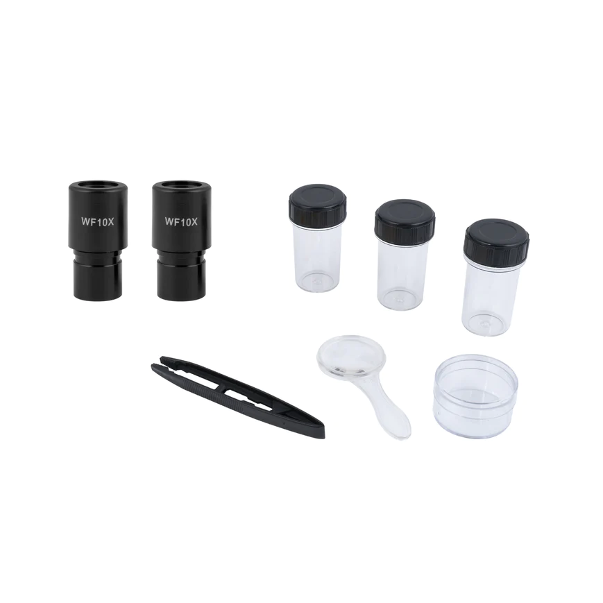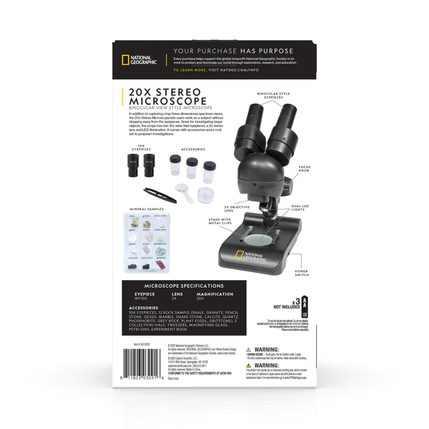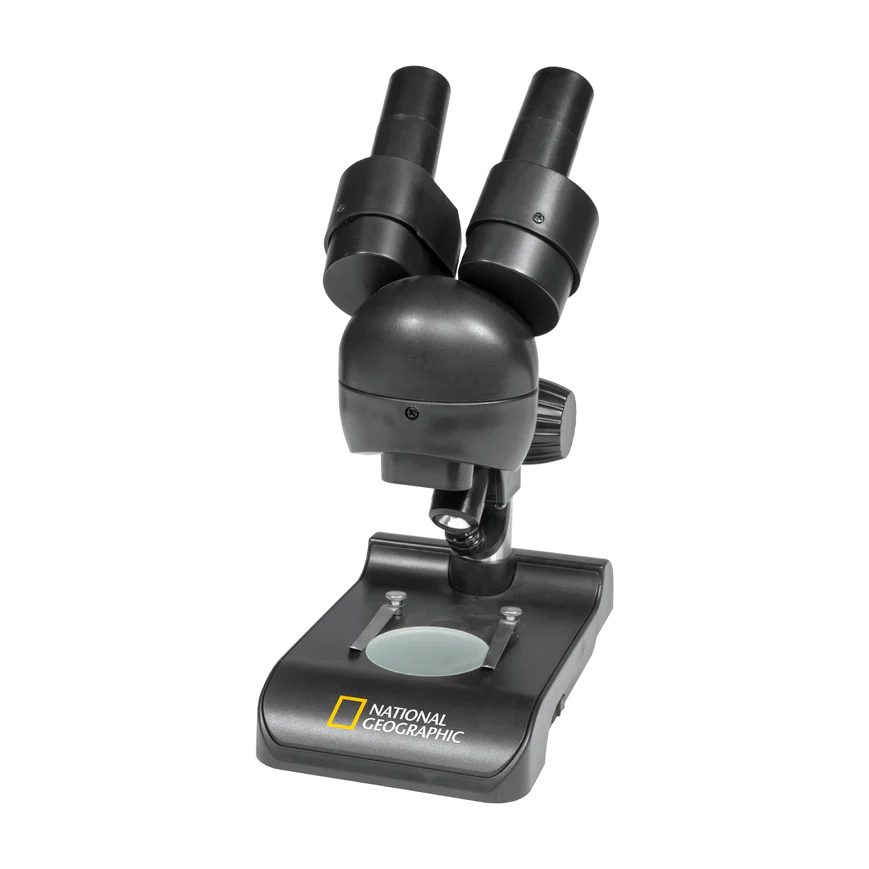 With its fixed 20x magnification, generous working distance and binocular-style eyepiece, the National Geographic Stereo Microscope is an ideal choice for investigating rocks, insects, fossils and other large specimens. The binocular-style eyepiece of this 20x microscope sits at a 45° angle to provide a comfortable viewing experience perfect for long observing sessions. To accommodate different observers, the barrels can be rotated closer or farther away from each other to meet individual interpupillary distance needs. The binocular eyepiece design also makes it easier for users to keep both hands free to work on a specimen while observing. For versatility, the National Geographic 20x Stereo Microscope offers two forms of LED illumination. The top light will highlight amazing surface details in opaque specimens, while the stage light can be used to illuminate slides or translucent objects from below. This illumination is battery-powered, which means the microscope is suited for in-the-field investigations when a power source may not be close at hand. In addition to its two 10x wide field eyepieces, the microscope set comes with 12 mineral samples, three collection vials, a magnifying glass, tweezers and a petri dish.