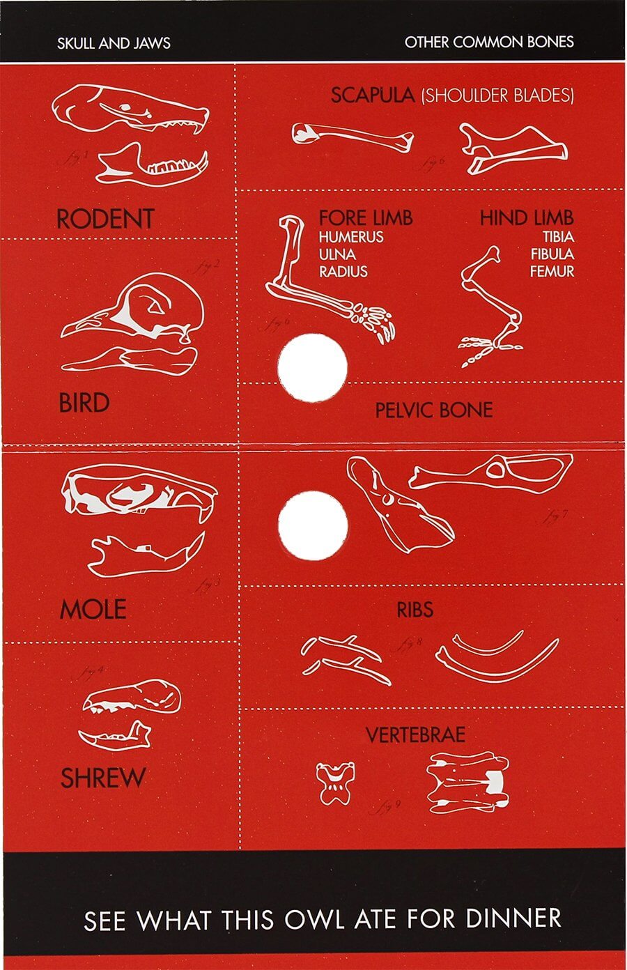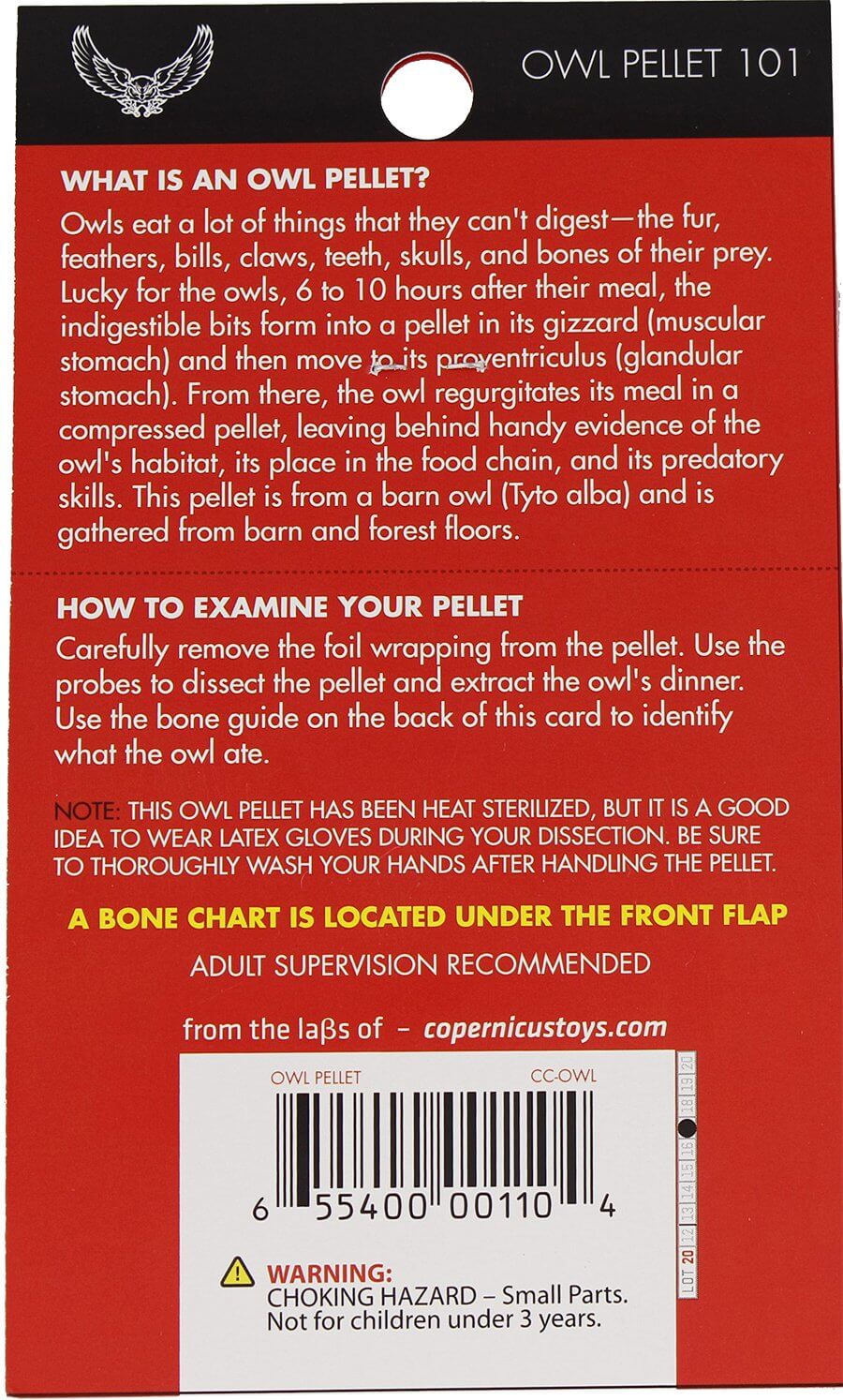 Ever wonder what owls eat? Dissect an owl pellet and find out! Owls regurgitate the indigestible remains of their meals, which make their diet easy to investigate. This pouch contains one sanitary owl pellet and a bone chart. Use a tweezers or other small tool (not included) to dissect the pellet and then identify the remains using the chart.