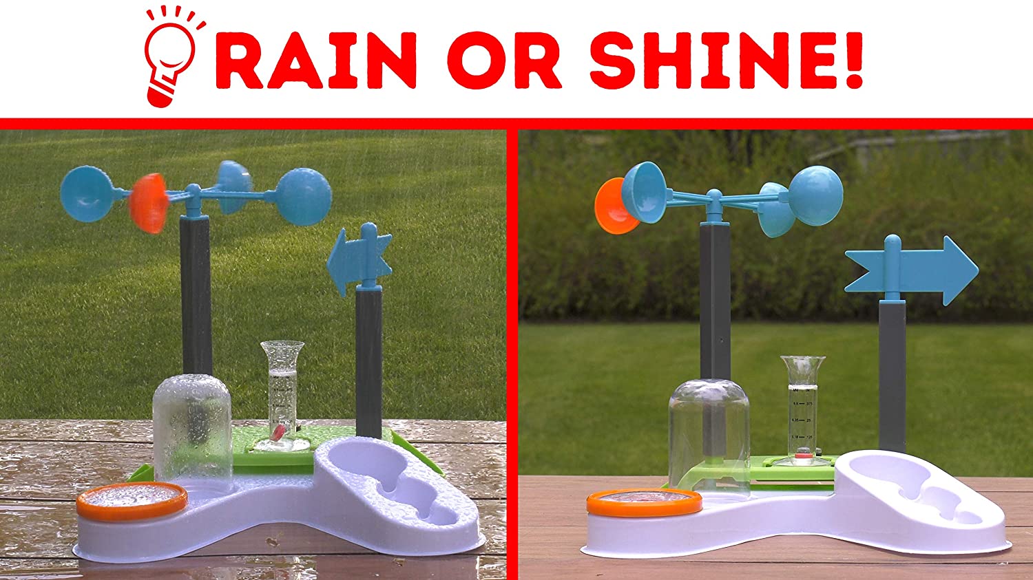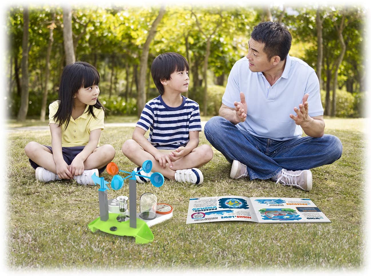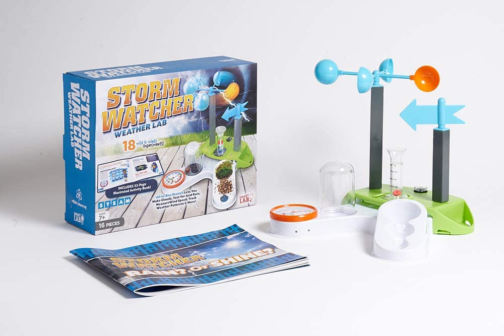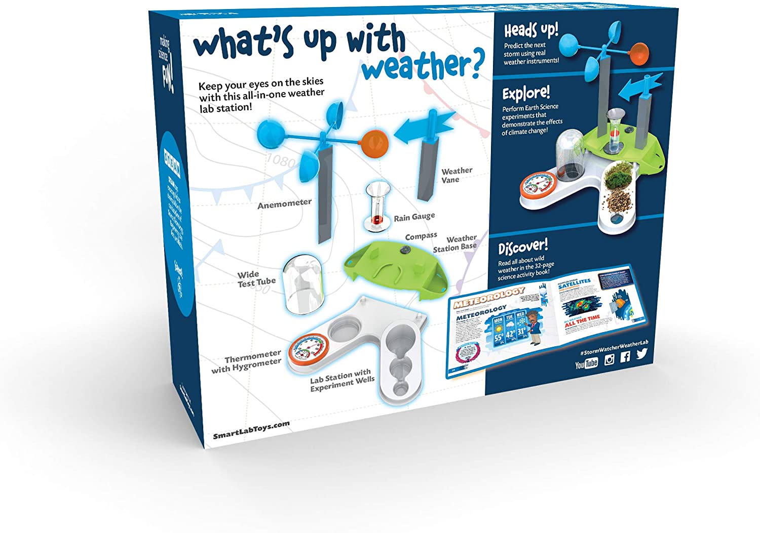 SmartLab Toys Storm Watcher Weather Lab is our new and improved all-in-one weather monitoring kit for the budding meteorologist. The lab base lets kids conduct experiments involving wind speed, wind direction, temperature, rainfall, atmospheric pressure, the water cycle, evaporation, the greenhouse effect, acid rain, drought, and more. The 32-page book gives kids a thorough understanding of what causes local weather and how it relates to climate change. A cloud identification chart and weather tracker ideas will have kids challenging their local weatherman for the most accurate predictions! This fun, educational kit includes: weather station base, lab station with experiment wells for a condensation station and filtration station, weather vane, rain gauge, anemometer, compass, wide test tube, thermometer with hygrometer, and a 32-page illustrated activity book packed with information about extreme weather.