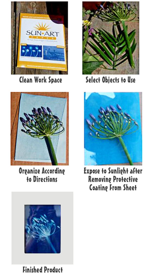 All you need is sunshine, water and your creativity to make unique and beautiful sun art prints! Place natural objects like flowers, leaves, shells or even man-made objects on the sun-sensitive paper. Set outside on a sunny or overcast day or even indoors in a sunny window. Sit back and watch as the sun turns the paper a beautiful blue!