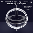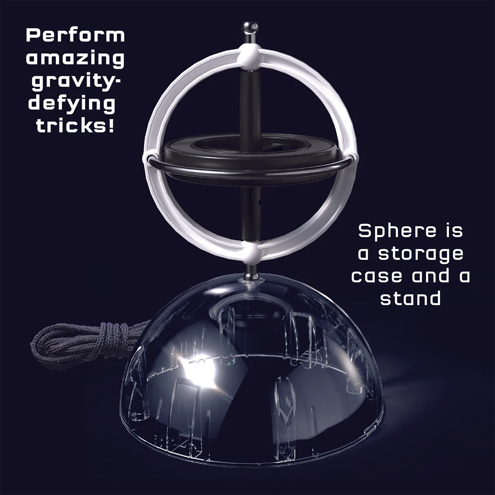 This timeless scientific instrument has been reimagined in a fresh, new design. Experiment with the gyroscope to learn about the physics of motion, forces, and gravity. Learn about gyroscopic forces, and see and feel them in action. Have fun getting your gyroscope to do classic physics tricks. Make the gyroscope balance on a tabletop, on a stand, and on a string. Spin the gyroscope inside the included clear plastic sphere and see and feel the forces acting on the sphere, which doubles as a storage case for your gyroscope. The gyroscope has a 3-inch diameter and is made of plastic and metal. It includes a clear plastic sphere (also functions as a stand and a storage case), a 30-inch string, and an instruction manual.