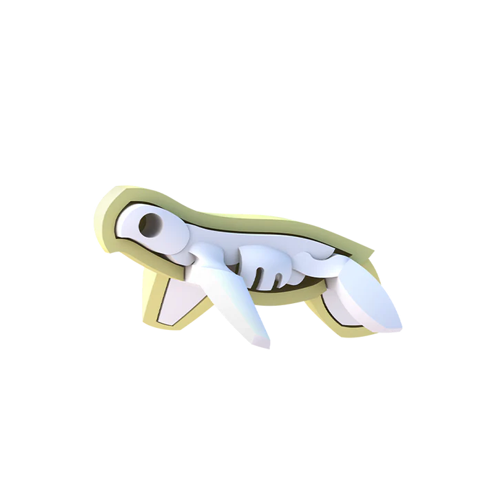 Green turtles are mainly found in tropical and subtropical waters. They are herbivores who graze on seagrasses and algae. Like other turtles, they travel long distances between feeding grounds and the beaches they hatched from. As a HALFTOY, you can open its magnetic shell to find the skeleton, a 3-piece bone puzzle. Each animal figure comes with a diorama that can be linked to other dioramas in the HALF OCEAN collection. Collect them all and build a scenic Ocean world!