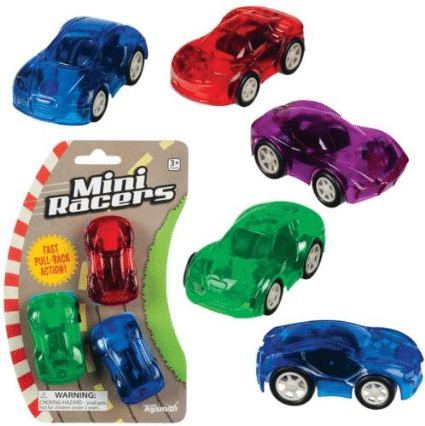 These little racers are have speedy pull-back action that your kids will love! They will want to play with and race these Mini Racers with their friends and siblings. These little cars are only 2 inches long and can easily be carried around in a pocket or purse for on-the-game entertainment for your little one! Colors may vary.