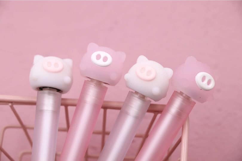 This 0.5mm finetip pen has smooth, black gel ink. Pig top spins with a flick! Available in white and pink styles.