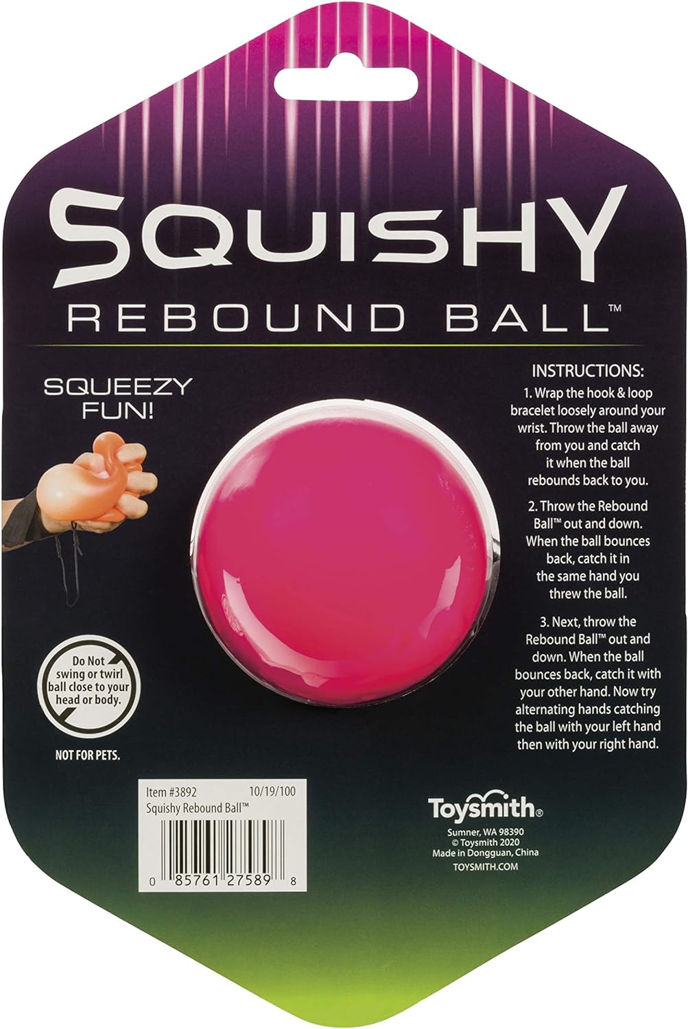 Two play patterns in one is twice the fun! This signature Rebound Ball gets a squishy twist The squishy ball has a 50-inch stretchable cord attached to a hook and loop wrist band Assorted colors - colors ship at random Recommended for age 5 years and up