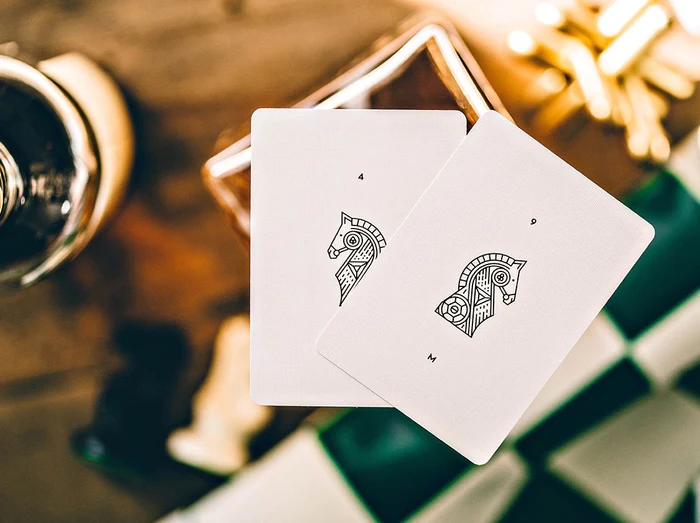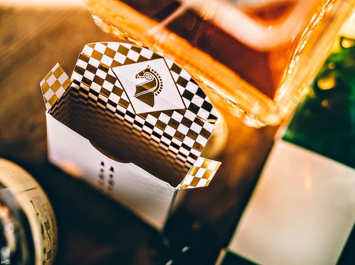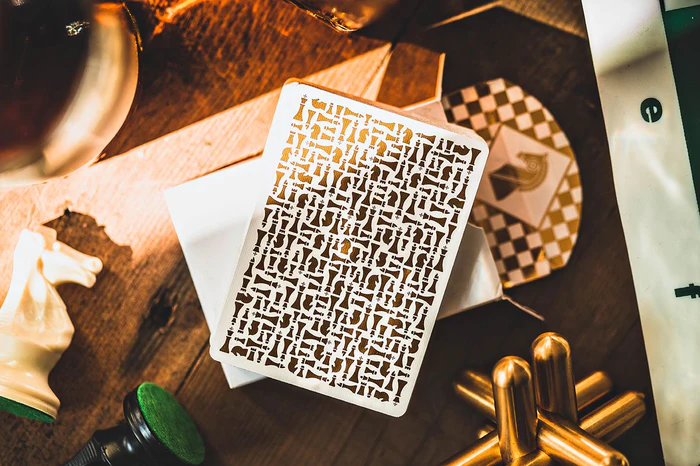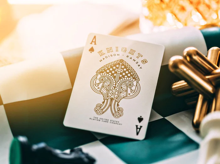 Daniel Madison and Chris Ramsay. Both are connected by their mutual love for magic, YouTube, tattoos and one more thing - chess. When they were both part of the Ellusionist team they created Knights Playing Cards. These popular cards have now made their comeback with a V2 edition. Inside of the matte tuck box is covered by a chessboard made out of gold foil. Back design, all Hearts and Diamonds and all court cards are covered in a metallic gold ink. Knights Playing Cards are also marked for value. Explanation for the marking system can be found on Chris Ramsay’s YouTube channel.