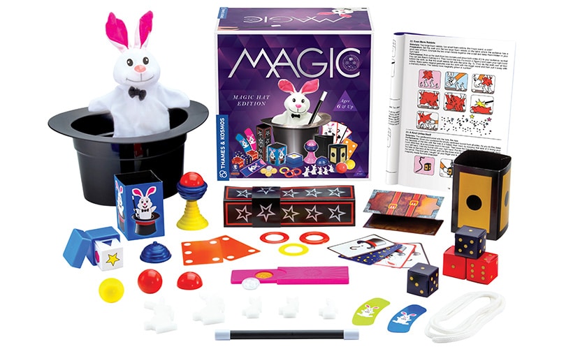 Pull a rabbit from a seemingly empty hat. Make a ball disappear from a magic cup, reappear again, and change color. Make cards grow and shrink. Make a coin disappear and reappear with a magic coin box. Use X-ray vision to magically see symbols through a solid, opaque surface.