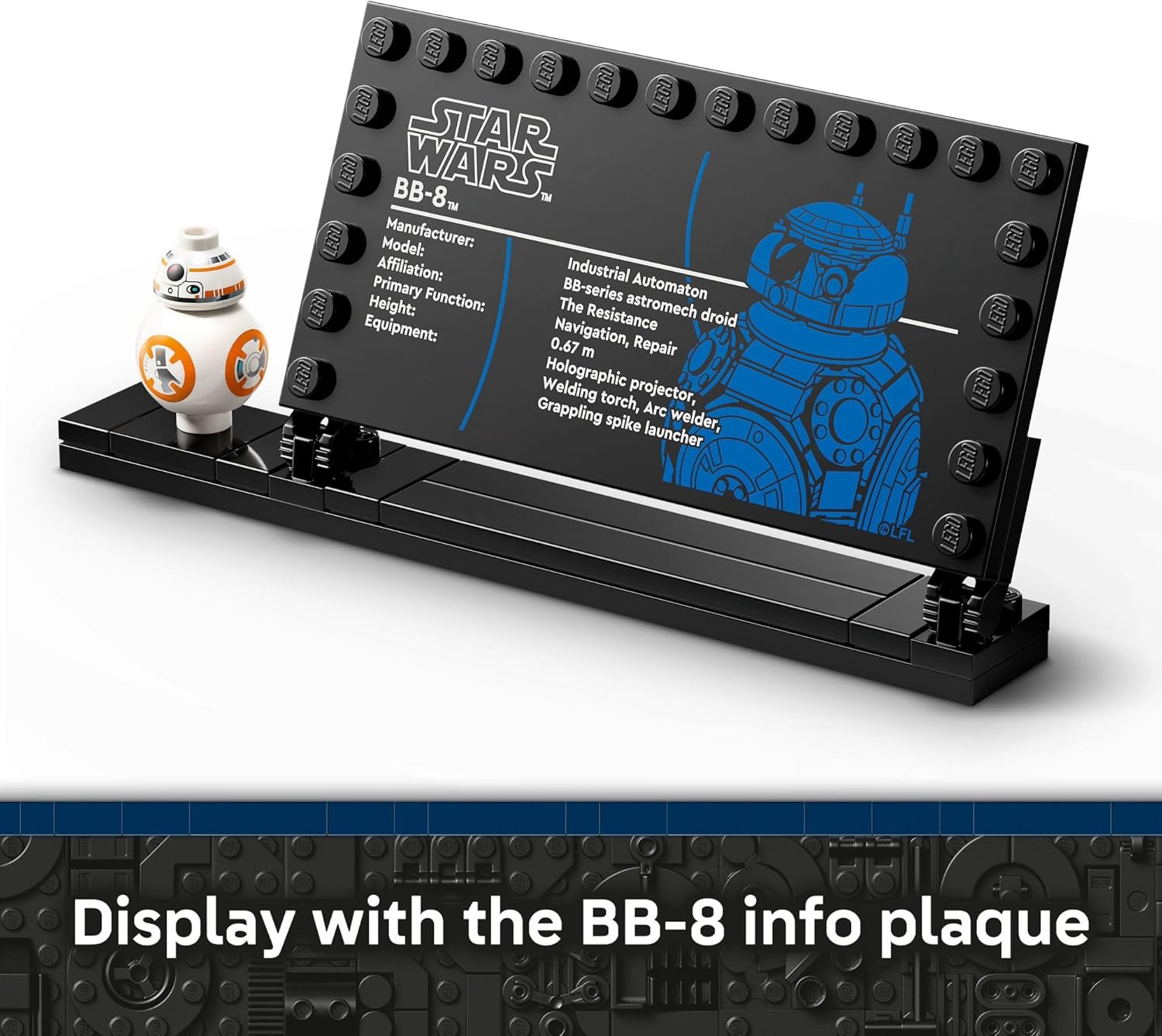 Kids bring the galaxy's most adorable droid to life with the LEGO Star Wars BB-8 Astromech Droid (75452) building toy for preteen boys and girls ages 10 years old and up. This building set lets Star Wars fans construct an authentic BB-8 droid as seen in Star Wars: The Force Awakens, featuring a head that automatically spins in random directions when moved across a flat surface. Builders can open the hatch on BB-8's body to reveal a hidden "burner arm," like the one he used to give Finn a "thumbs-up" in the movie. This set includes a buildable BB-8 model, an info plaque and a standard-size BB-8 figure for display, creating eye-catching Star Wars toys for any collection. Makes a fun Star Wars gift, birthday present or anytime treat for boys, girls and fans. The LEGO Builder app includes digital tools that let kids track progress, zoom in and rotate models using 3D instructions. Contains 569 pieces.