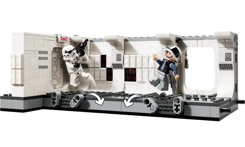 Build, play and display – The Tantive IV corridor buildable model in this 502-piece set measures over 3 in. (8 cm) high, 8.5 in. (22 cm) wide and 5 in. (13 cm) deep