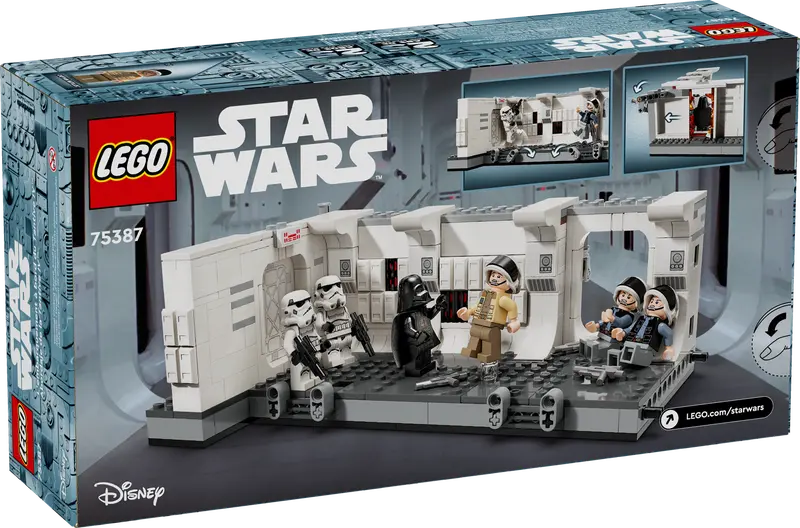 Relive Darth Vader and his Stormtroopers boarding the Tantive IV in Star Wars: A New Hope with this buildable toy playset (75387) for kids aged 8 and up. It features a detailed recreation of the corridor inside Tantive IV where Darth Vader’s Stormtroopers battled Captain Antilles’ Rebel Fleet Troopers, with levers to ‘blast’ open the entrance door and topple characters during battle play. Connectors allow builders to add another 75387 set (sold separately) to extend the corridor.