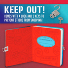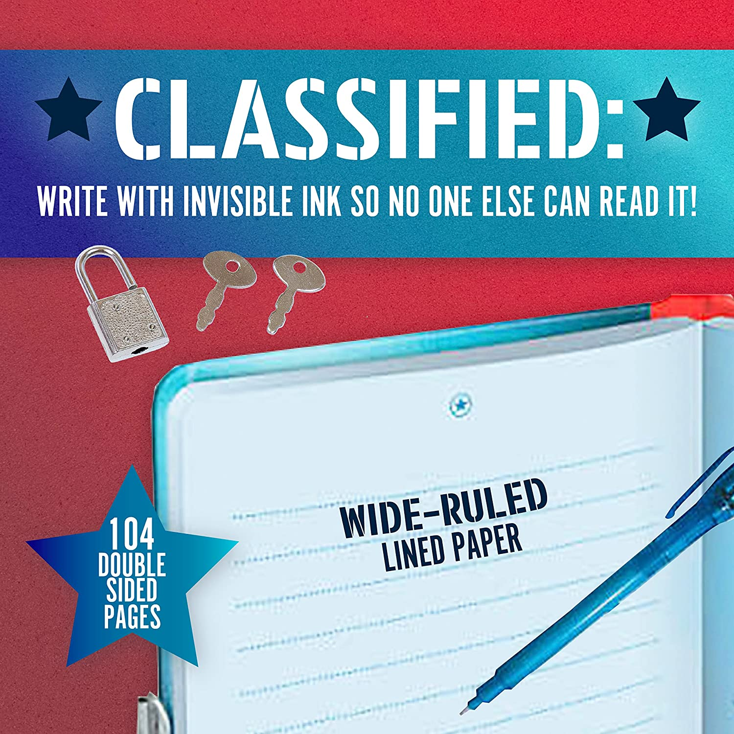 DETAILS: Top Secret diaries measure 5.5” wide x 6.25” high. For ages 5 years old and up. Comes with 104 double-sided lined pages and lock and key. It features a blue and red diary that says “top secret.”