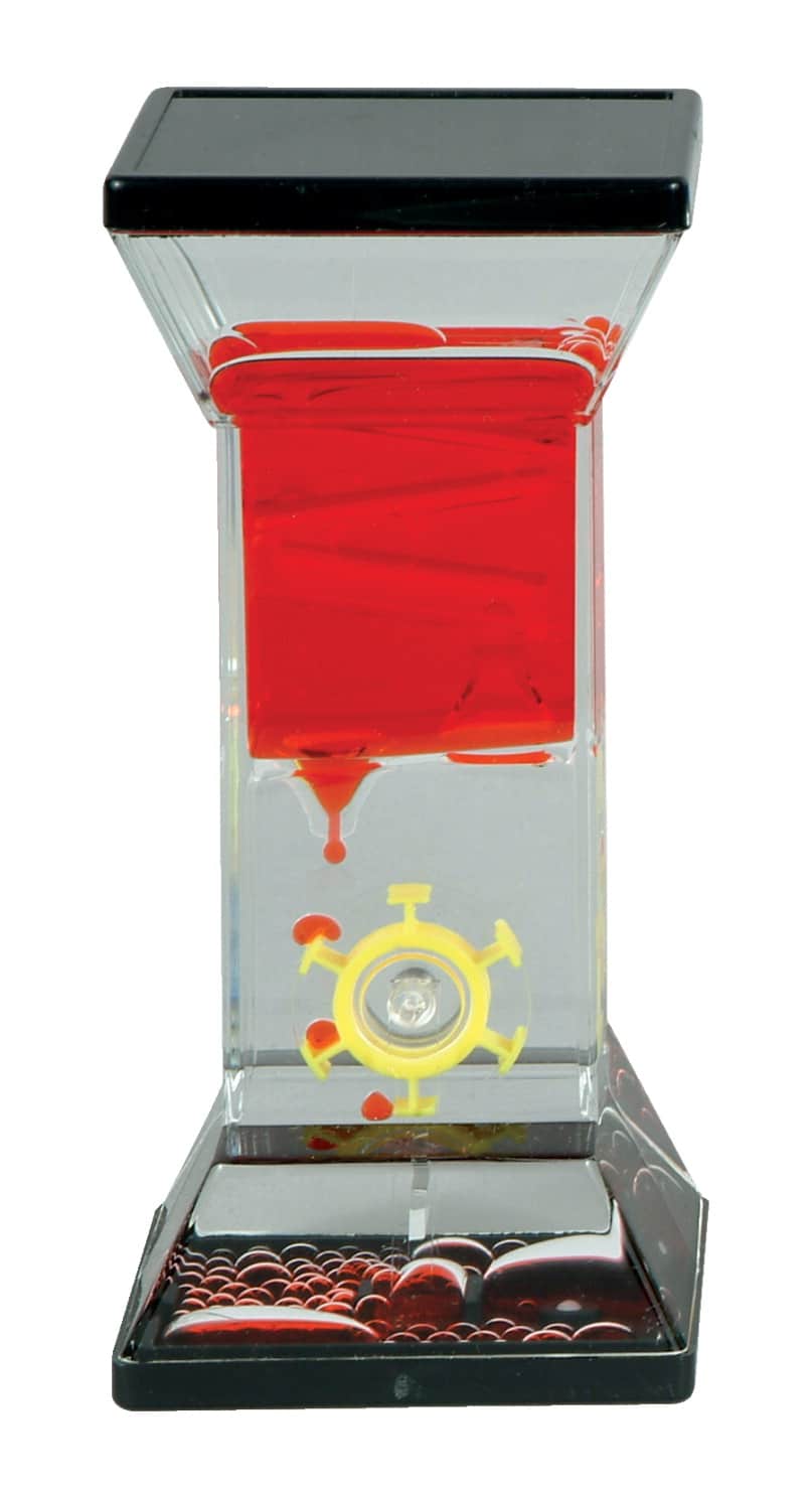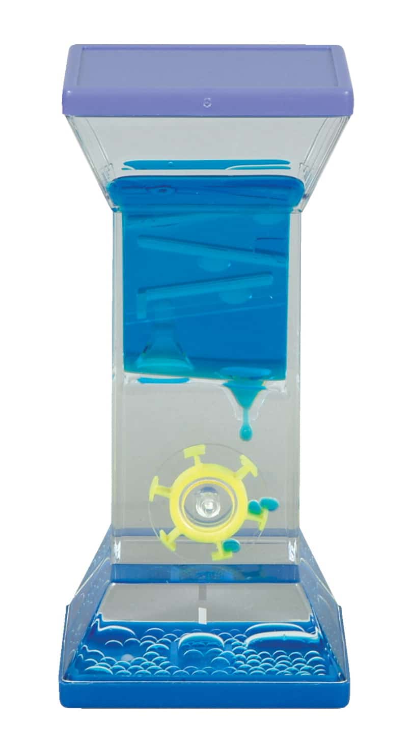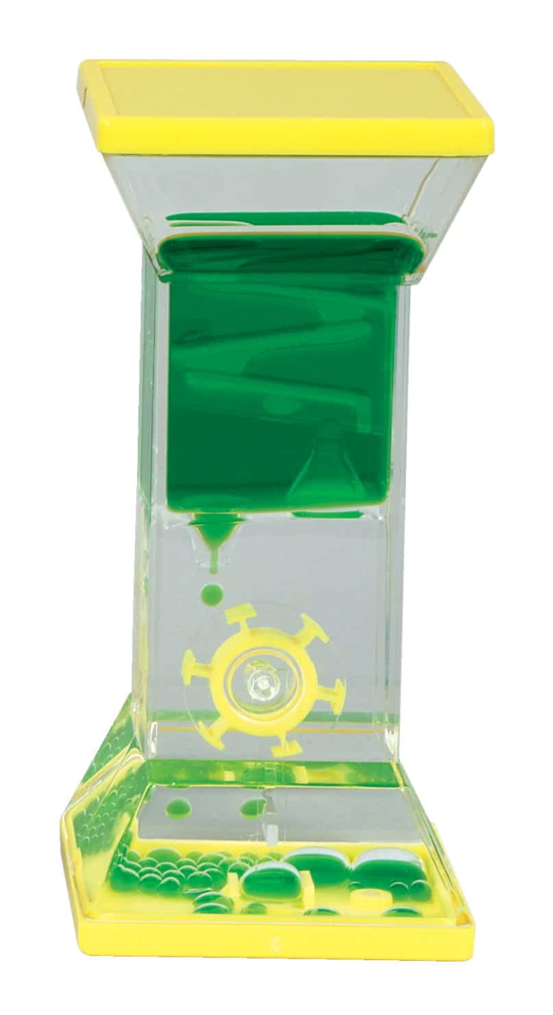 Art, motion, and science combine with this one-of-a-kind liquid timer! This Color Drops Zig Zag device by Westminster features a zigzag patterned "path" on one end and a wheel that churns the spins the droplets on the other end. Simply turn over the device and watch thick colored bubbles slowly flow and maneuver through the maze and topple through the moving wheel! Exterior device is made of durable plastic that resists breaks or cracks if device is dropped, while square bases on each side provide sturdy hold on flat surfaces. Colored oil content inside is non-toxic and non-flammable. Assorted colors.